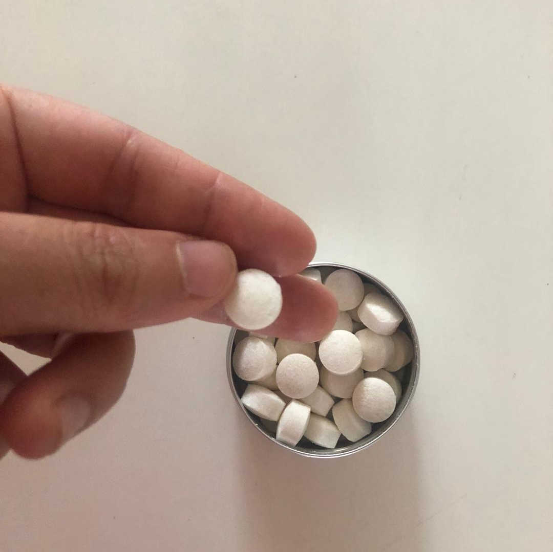 전성분 중 유효성분은 이산화규소, 플루오르화나트륨, 피로인산나트륨, 피리독신염산염, 기타 첨가제로 D-소르비톨, 미결정셀룰로오스, 제이지엑스, 스테아린산마그네슘, 유자추출물, 자일리톨, 잔탄검, 죽염, 코코일글루타민산나트륨, 탄산수소나트륨, 하이드록시프로필셀룰로오스, 향료, 효소처리스테비아 총 17가지 입니다. 휴대용은 둥근 틴박스에 30정이 들어있고 가격은 5,300원이고, 리필용은 180정이 들어있으며, 가격은 15,900원입니다. 휴대용은 친구들에게 제로 웨이스트를 소개하며 선물하기 좋은 아이템!