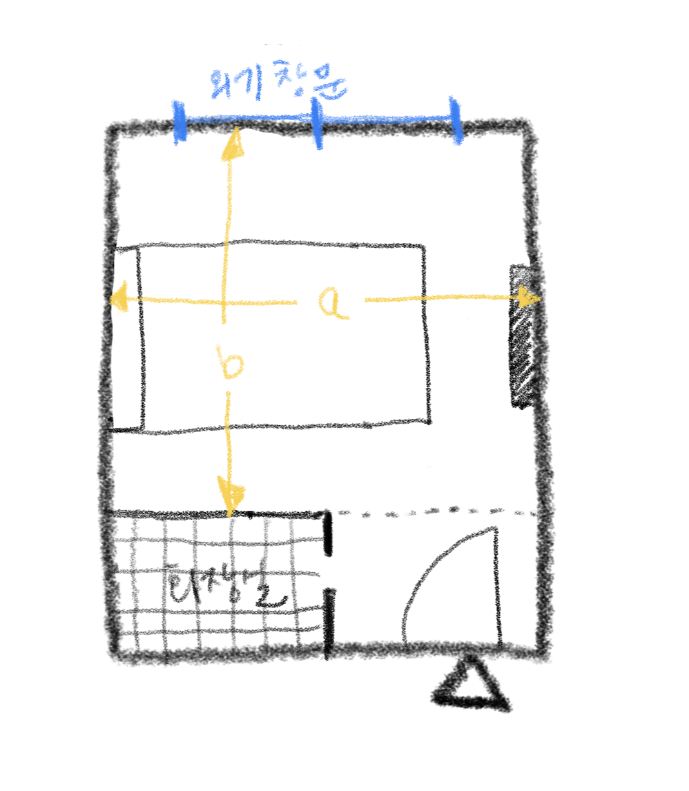 - 실폭 = 욕실 최소 폭 + 출입문 폭 + 반침 깊이, 실폭의 2배 = 기둥의 간격