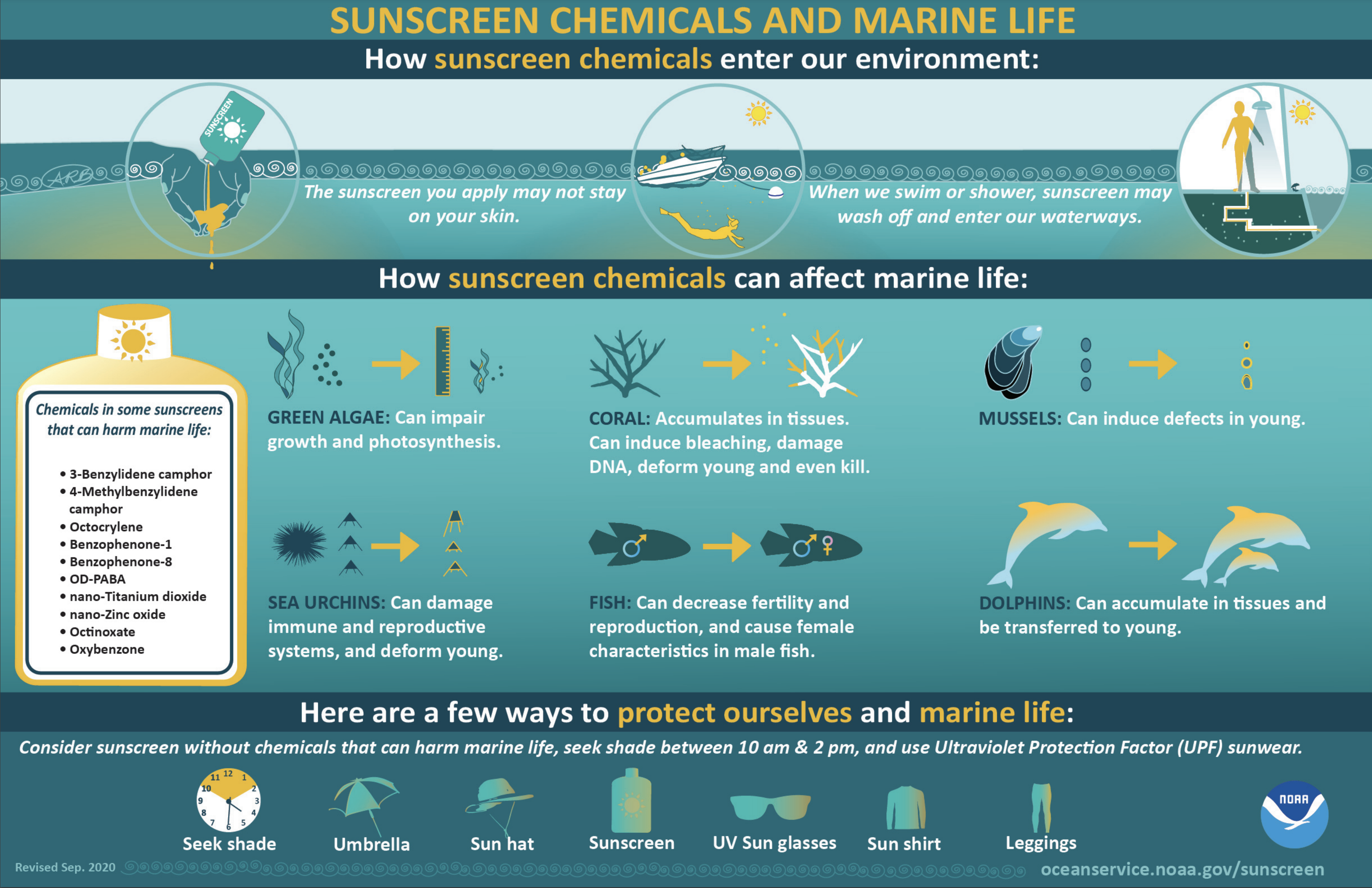 바다 생태계를 교란시키는 성분을 함유한 차단제를 바르면 우리의 피부를 보호할 수 있지만, 성분이 물에 씻겨나가며 해양 생물을 비롯 바다를 오염시킨다.