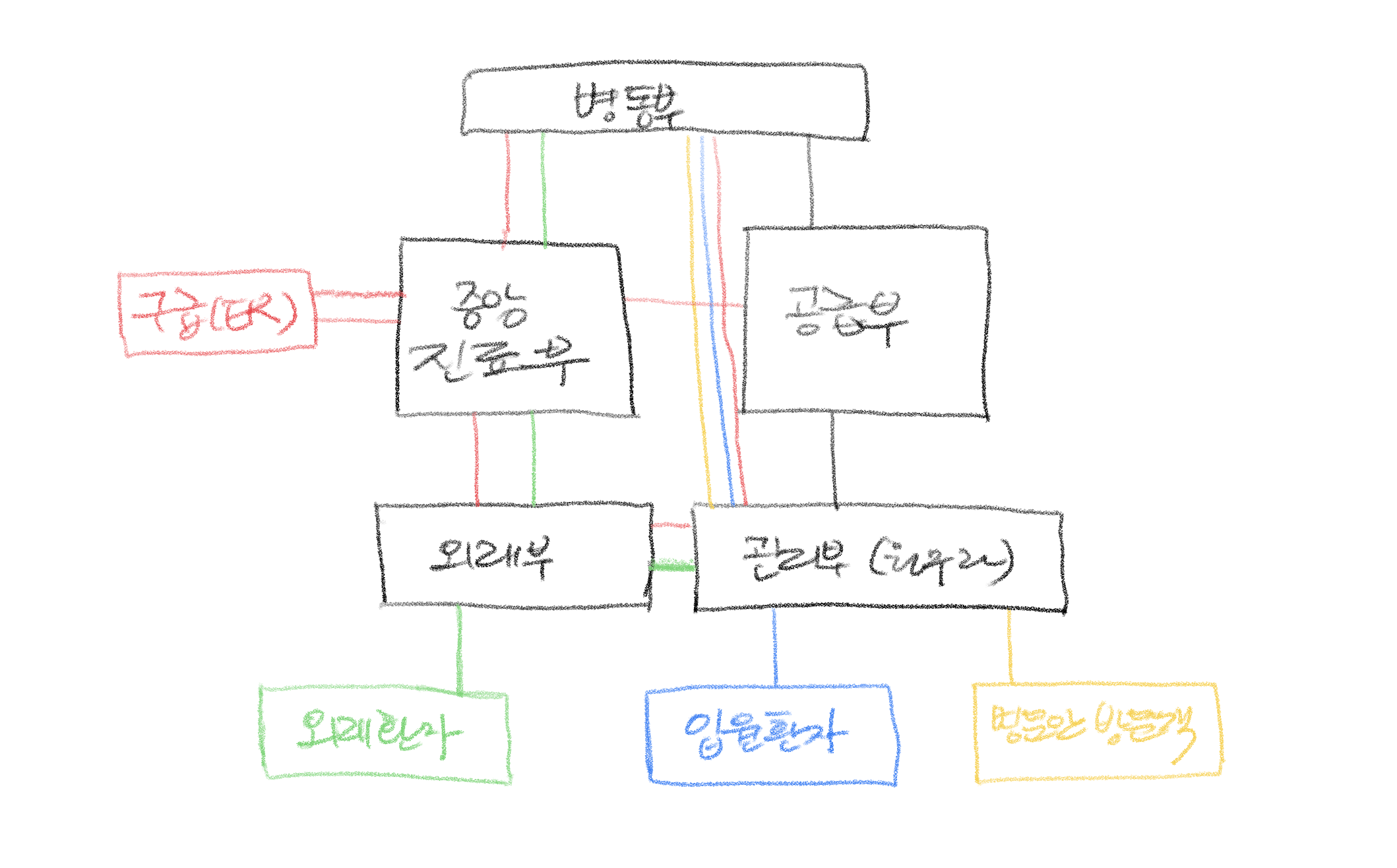 - 약국, 중앙주사실, 회계 등은 정면 출입구 근처에 둠