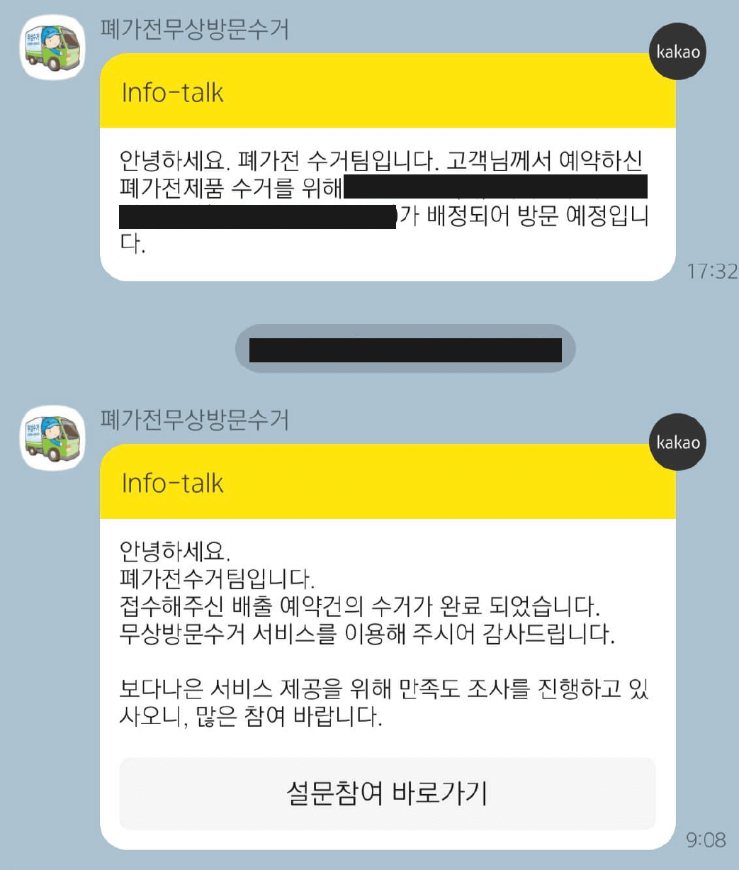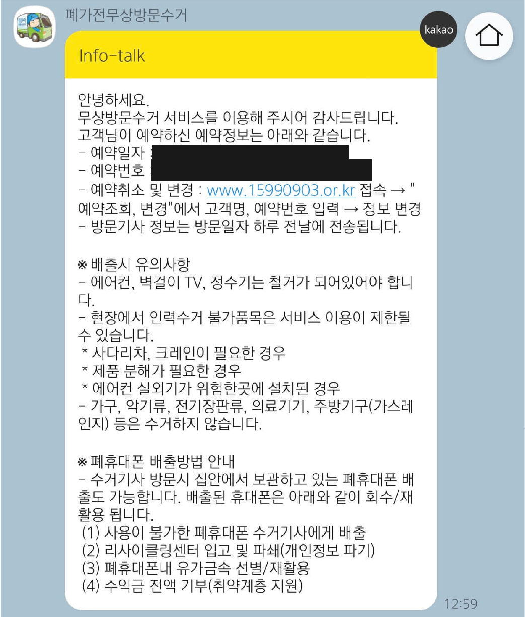 무상방문수거 서비스 신청은 매우 간단하고, 피드백도 빠릅니다. 나는 인터넷으로 배출서비스 신청을 했는데 바로 카카오톡으로 알림 문자가 왔습니다. 방문 수거 당일에 아침 일찍 집을 나와야해서 고장난 TV를 현관 앞에 놓고 나간다고 기사님께 문자를 드렸더니 9시에 수거해서 가셨습니다. 수수료 없이 너무 간편하게 폐가전을 처리할 수 있었습니다. 더군다나 개인정보로 꺼려졌던 "폐휴대폰 버리기" 도 온라인으로 신청이 가능했습니다. 폐휴대폰 내 유기금속을 선별하고 재활용한 수익금의 전액을 취약계층에게 기부가 된다고 하니, 얼마나 좋은 서비스인지. 도시광산에서 선하게 채광하는 것과 같습니다.