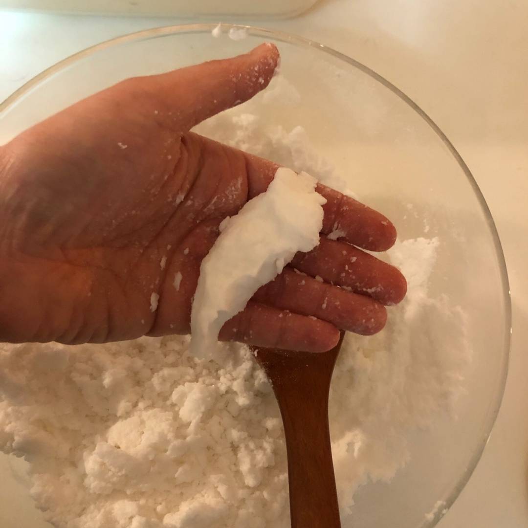 4. 거품기 등으로 3가지 재료를 잘 섞습니다. (눈덩이가 뭉친 정도)