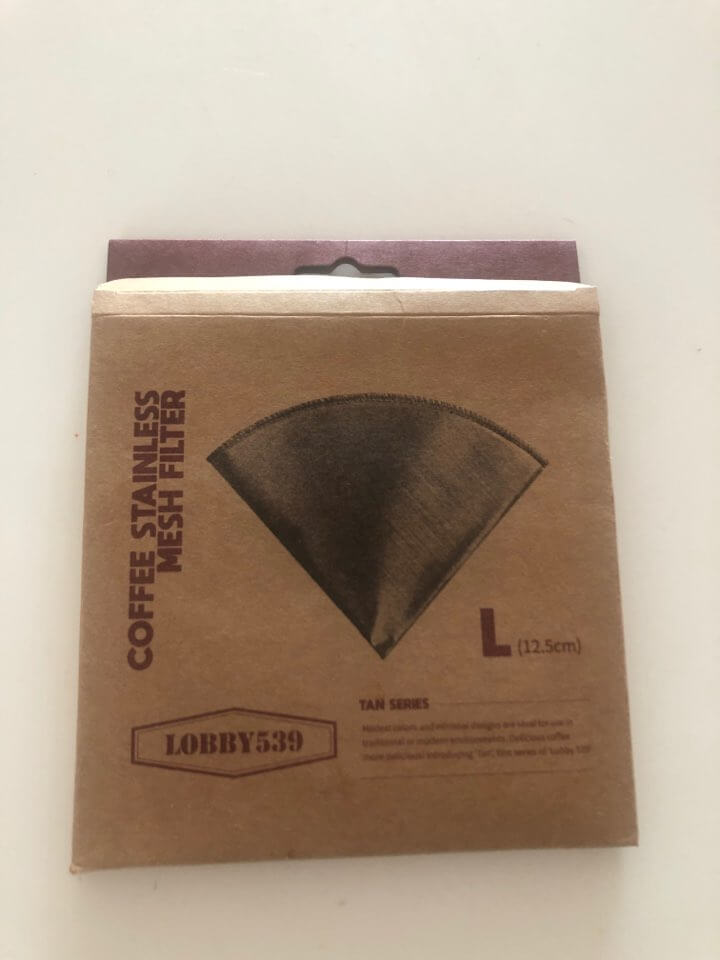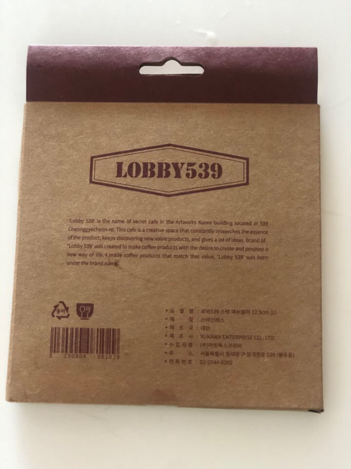 로비 539 메쉬 커피 필터. 포장부터 매우 간단 명료하다. 제품 구성은 있는 스테인리스 스틸 메쉬 (망이라고 하지만 천처럼 보들보들하다.) 필터로 핸드 드립시 종이 필터 없이 영구적으로 사용 가능하다. 본인은 커피 맛에 대해 잘 모르지만, 스테인리스 메쉬 필터가 종이 필터와 다른 점은 커피 오일까지 추출하기 때문에 깊은 풍미와 묵직한 맛을 내기에 최적화되어 있다고 한다.