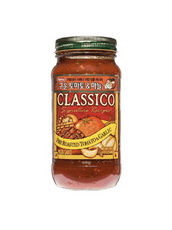 하인즈 클래시코 파스타 소스 | 밀봉 효과가 뛰어나서 저장용기로 유명한 메이슨 자 (Mason Jar) 에 파스타 소스가 담겨져 있습니다. 용량을 잴 수 있는 눈금도 새겨져 있어서 유용합니다.