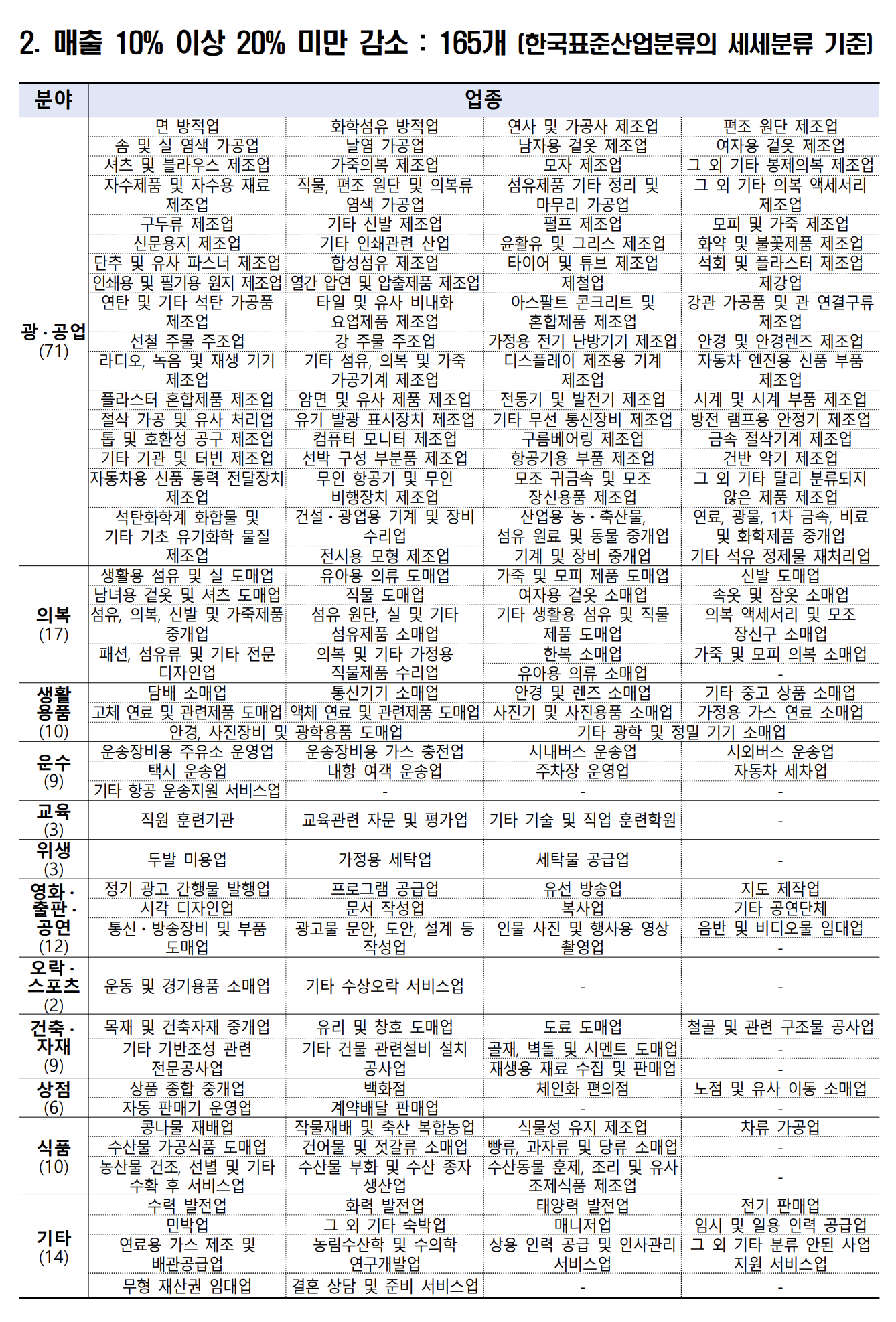- 매출액이 소기업에 해당하는 사업체, 10~ 120억원 이하 (음식, 숙박, 학원: 10억원, 도소매: 50억원 등)