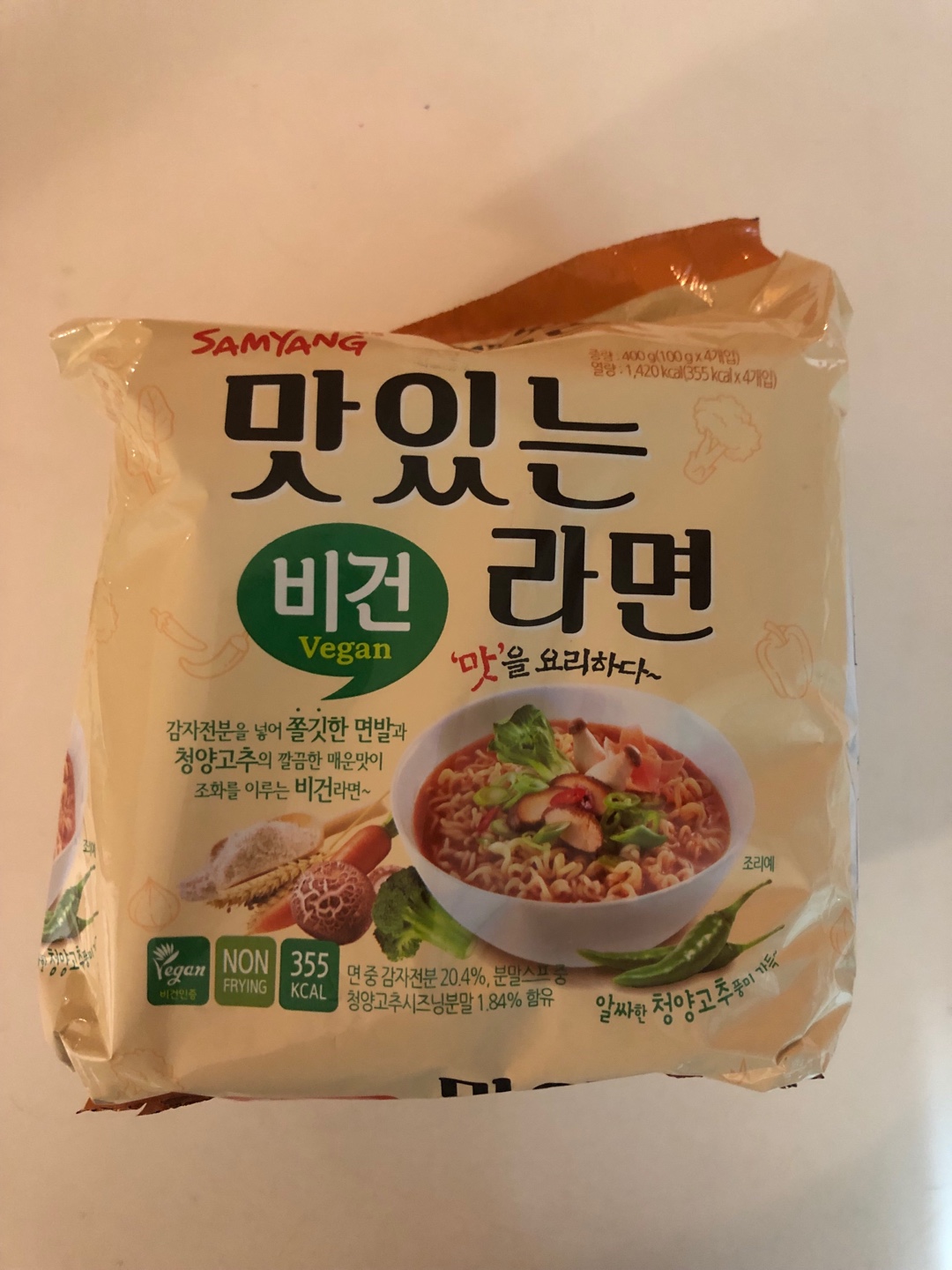 어찌되었건, 삼양식품의 비건 맛있는 라면은 감자전분을 넣은 쫄깃한 면발과 청양고추의 깔끔한 매운맛이 조화를 이루는 비건라면. 기존 맛있는 라면 봉지는 흰색인 반면 감자전분함유를 강조하는 황토색 봉지로 구수한 맛일 날 것 같은 이미지입니다. 타 사 라면은 야채맛이 풍부하고 구수한 맛이 나지만 매운 걸 좋아하는 저에게는 맛이 슴슴(?) 느끼해서 꼭 라면 먹을 때 청양고추를 넣어 먹습니다. 맛있는라면은 별첨으로 청양고추 조미유가 들어있어서 맛이 어떨지 궁금합니다. 가격은 4봉에 4,380원 (1봉에 1,100원 정도 하네요.) 비건 라면은 다른 보통 라면에 비해 약간 비쌉니다. 그래도 비싼 만큼 재료와 공정과정을 믿고 구매한다고 생각한다면 비싸다는 생각은 들지 않습니다. 그렇다면 정말 비건 인증은 확실할까요?