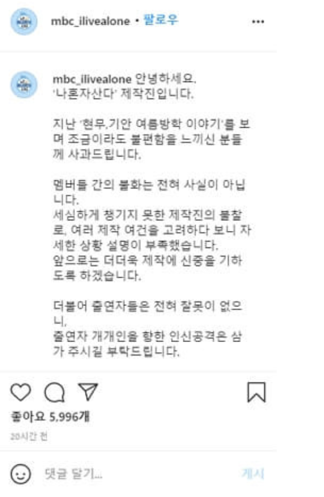 펜싱선수 오상욱의 에피소드가 방송된 날 직후 21일 새벽 나 혼자 산다 공식 SNS 계정을 통해 '현무, 기안 여름방학 이야기를 보며 조금이라도 불편함을 느끼신 분들에게 사과드립니다"라고 사과문을 올렸다. 제작진은 멤버들 간의 불화는 전혀 사실이 아니며, 제작에 신중을 기하도록 하겠다며 개인을 향한 인신공격은 삼가해 주기를 당부하였다.