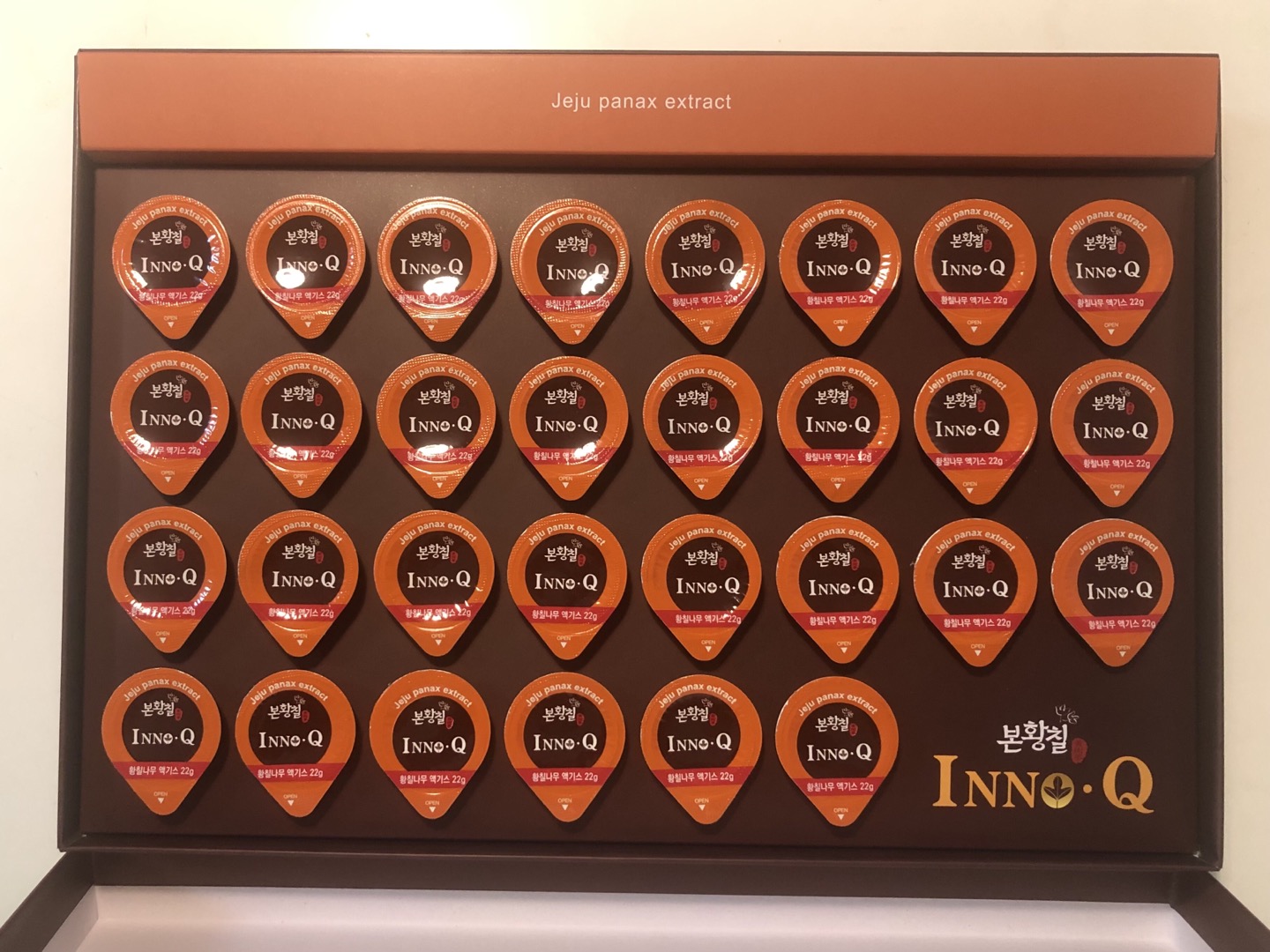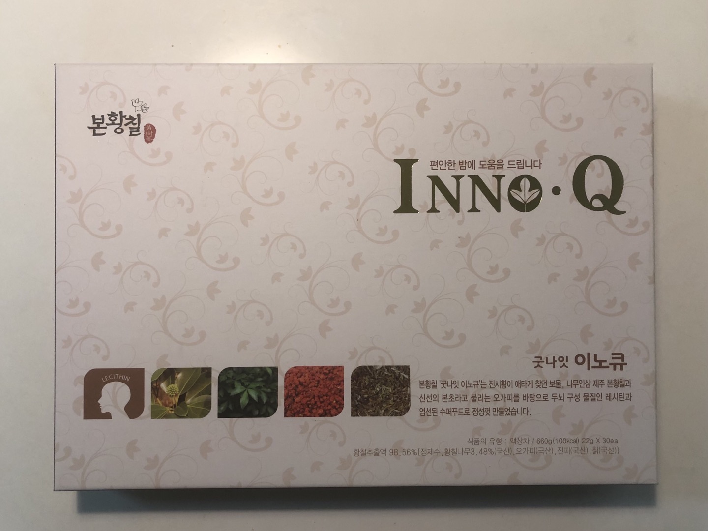 본황칠 이노큐는 진시황의 불로초라고 불리는 나무인삼 제주 본황칠과 신선의 본초라 불리는 제주섬오갈피를 바탕으로 두뇌구성물질인 레시틴과 엄선된 수퍼푸드로 만들었다고 한다. 합성감미료, 합성착색료, 합성보존료를 전혀 넣지 않았다고 한다. 본황칠의 "황칠"은 제주의 엄선된 품질의 나무인삼 황칠나무를 일컫으며, 제주의 엄선된 품질의 나무인삼을 "본황칠" 이라고 한다. 황칠이 옻나무라고 생각하는 소비자가 많아서 그런 것인지 설명문에 옻나무와 관련된 원료를 전혀 사용하지 않았다고 명시되어 있다.