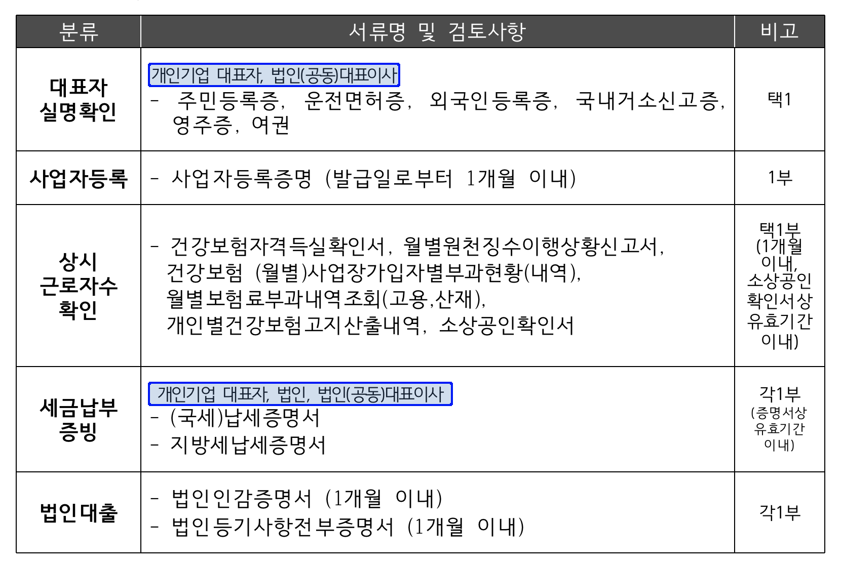 대출 신처시 필요한 서류는 간단하다. 대표자 실명확인을 위해 기업체 대표자 신분증과 사업장등록증명, 건강보험자격득실확인서와 같은 상시 근로자수를 확인할 수 있는 서류, (국세)납세증명서, 지방세납세증명서, 법인인 경우, 법인인감증명서와 등기사항전부증명서 (1개월 이내)을 구비하면 된다.
