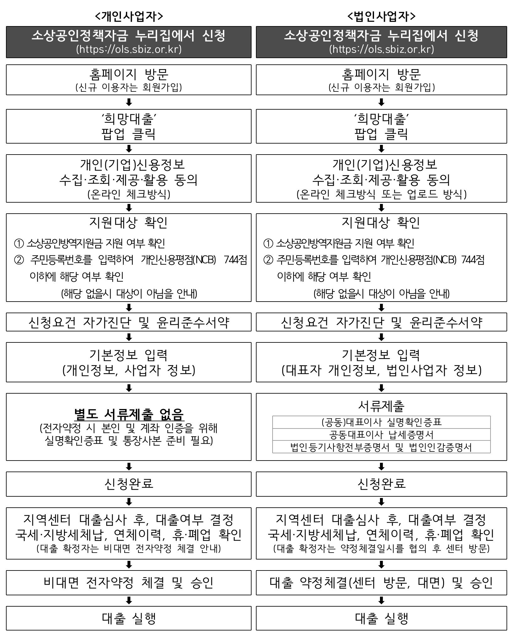 희망대출 신청은 코로나 19 확산을 방지하기 위해 소상공인 정책자금 웹사이트에서 진행한다. 신속 처리를 위해 결격사유 (세금 체납, 금융기관 연체, 휴폐업, 소상공인 미해당, 일상회복 특별융자 중복 등)만을 확인하는 간이 심사를 거친다. 심사가 통과되면 신청자에게 문자로 대출 승인을 통보한다. 개인사업자인 경우 비대면 전자약정으로 체결하고, 법인사업자인 경우 대표 또는 위임자가 가까운 지역센터에 방문하여 대면약정을 체결한다. 최종적으로 대출이 실행된다.