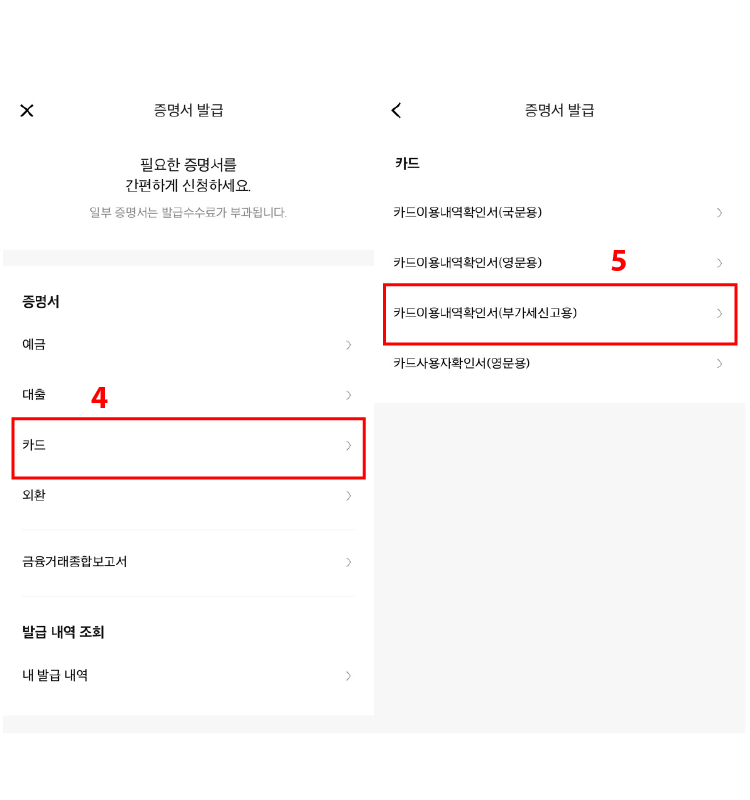 카카오뱅크앱> 전체메뉴 (...)> 고객센터>증명서발급> 카드> 카드이용내역확인서 (부가세 신고용)