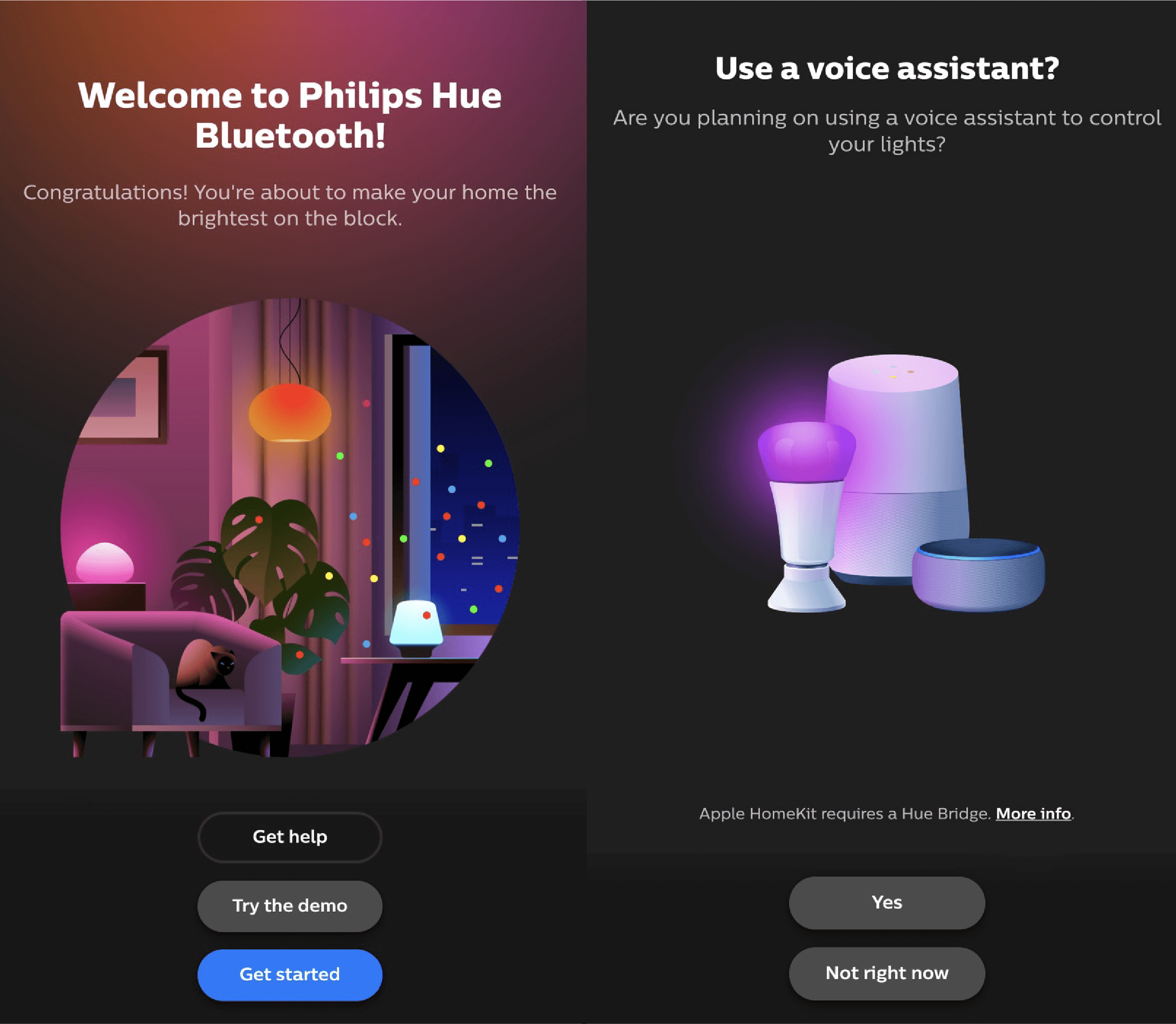 블루투스 연동 전에 핸드폰에 블루투스를 켜놓으셔야 합니다. 조명에도 전원을 연결해 놓아야 합니다. 이제 앱을 켭니다. 시작하기 Get Started 을 누룹니다. Google home 이나 Amazon Alexa, Apple Homekit 기기 등으로 음성으로 조명을 제어하고자 한다면 Yes, 블루투스로만 연결한다면 Not Right Now를 누르시면 됩니다.