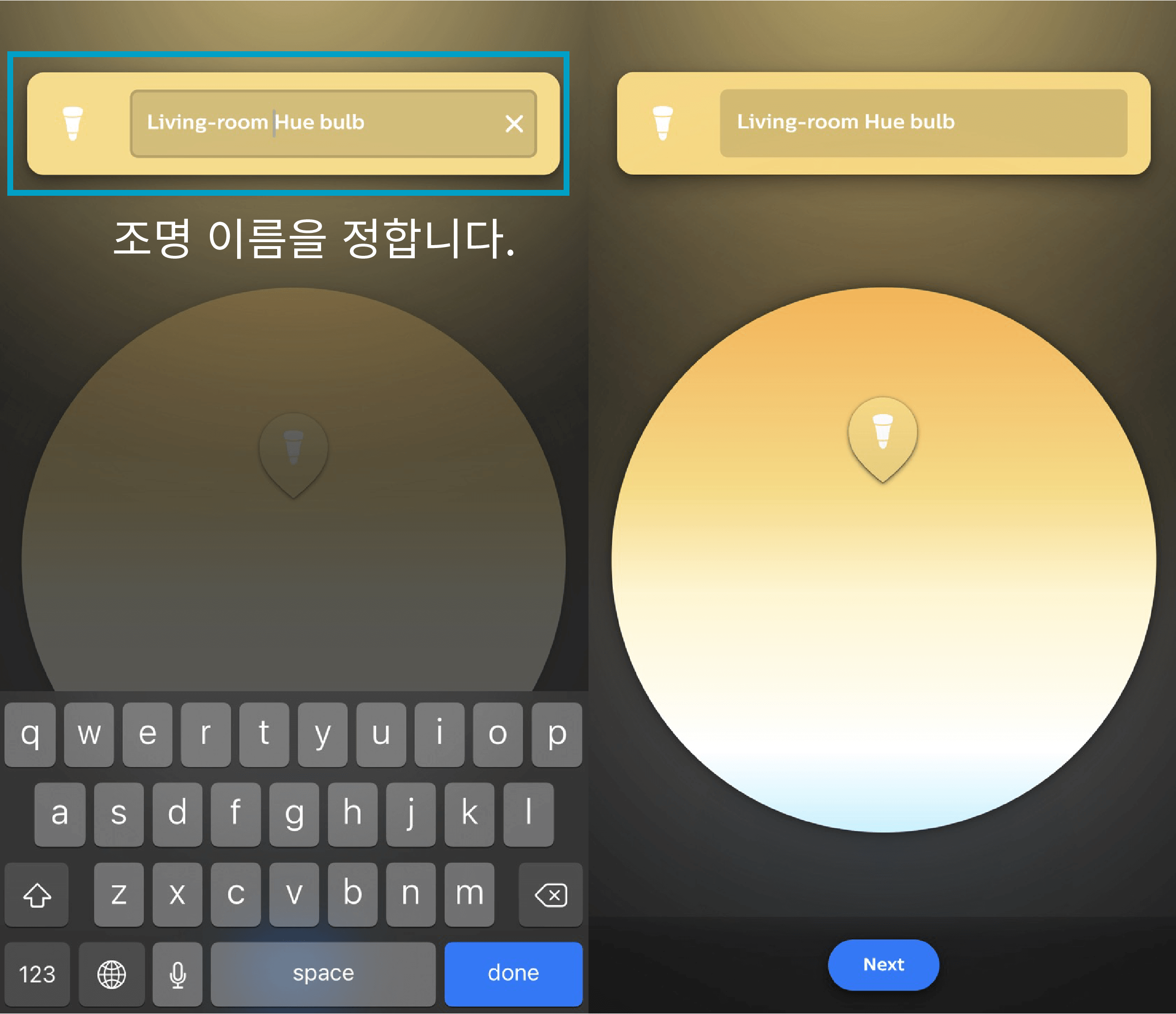 블루투스와 연동할 조명과 스마트폰을 가까이하면 앱이 자동으로 조명을 찾습니다. 조명 이름을 정해줍니다. 설정이 매우 간단합니다. 필립스 휴 블루투스 앱에 조명 최대 10개까지 추가 가능하고, 조명으로부터 반경 9m 내에서 앱으로 모두 제어할 수 있습니다. 침대에서 거실등을 끄고 싶을 때 핸드폰으로 끄면 되니 너무 편합니다.