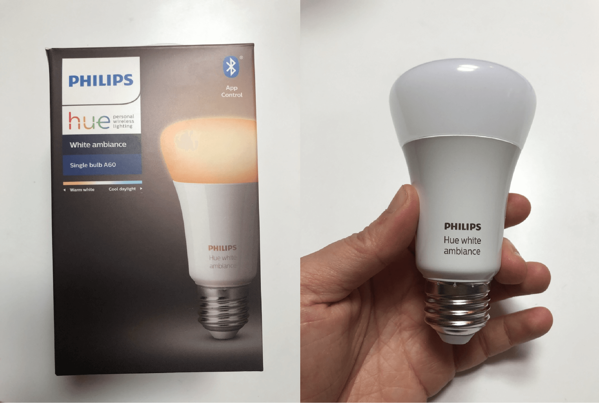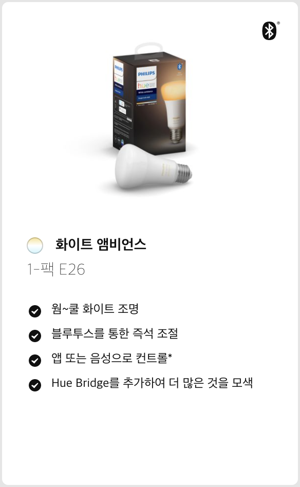 저는 이번에 웜-쿨 화이트 조절 가능한 전구를 원했기 때문에 휴 화이트 앰비언스를 구매하였습니다. 휴 브릿지와 함께 있는 세트 상품도 있지만 저는 외출 시 얼마나 외부에서 조명을 껐다 켰다할까 싶어 나중에 악세서리는 추가 가능하니 전구만 구입했습니다. (굳이 세트로 살 필요 없는 것 같아요.)