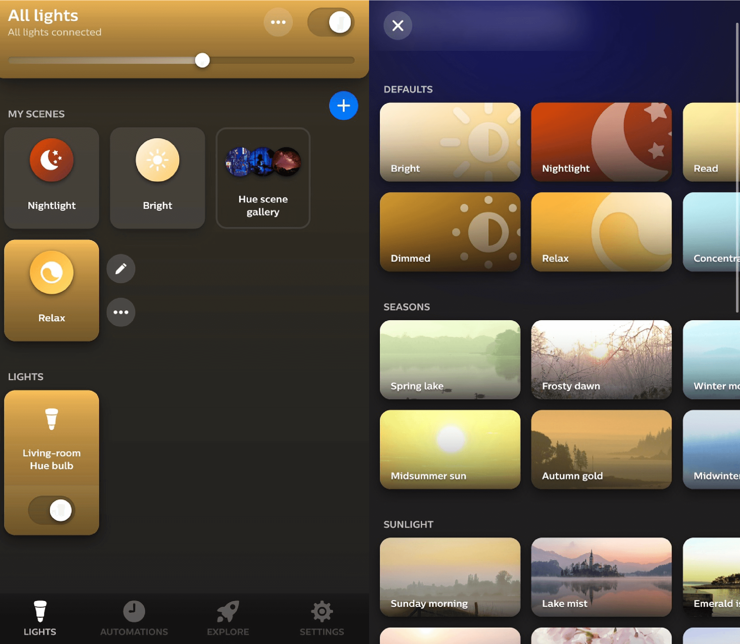 아침에 활기차게 시작하기 위해 'Bright'로 설정해도 되고, 쉬는 시간에는 'Relax' 등 하루 중 시간대와 활동에 맞는 조명을 선택할 수 있습니다. 좋아하는 조명 분위기만 따로 모아 저장 해서 원하는대로 조명 설정을 할 수 있습니다.