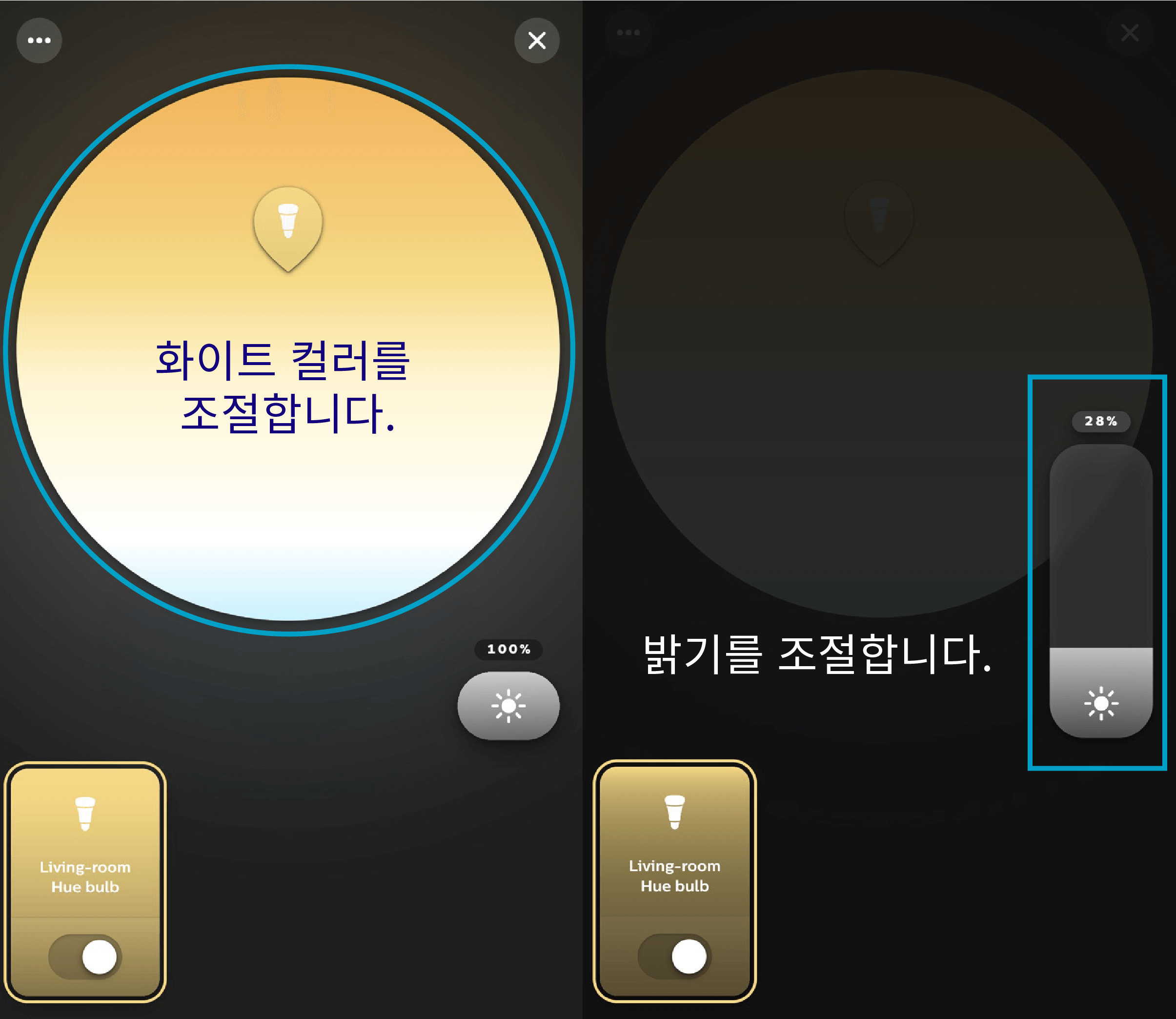 직관적인 디자인으로 손가락으로 조명의 밝기를 조절하거나, 온도나 색을 변경할 수 있습니다. 설치 첫 날에는 너무 신기해서 조명을 껐다 켰다가 색온도와 밝기도 조절했다가 신박한 제품과 재밌게 놀았습니다.