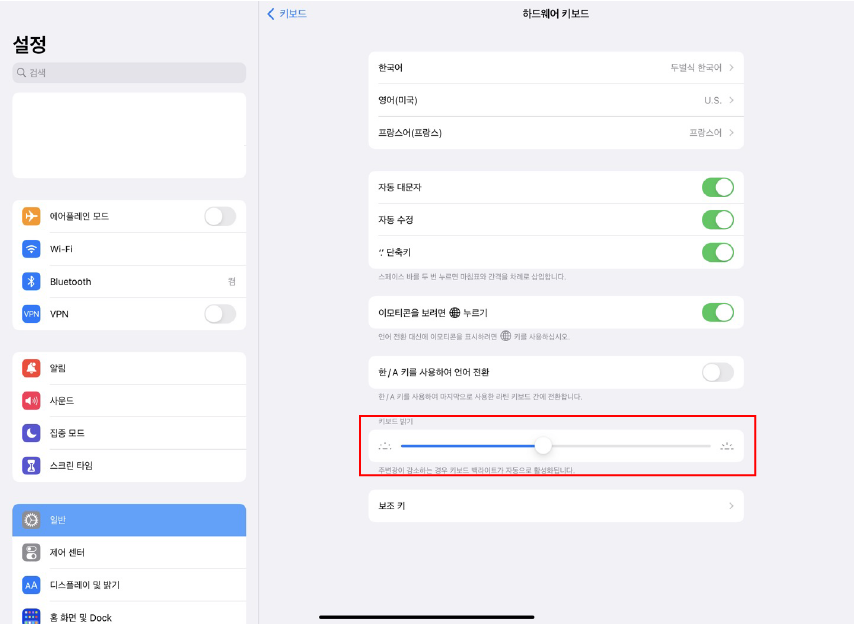 아이패드 센서가 가려진 것도 아니었고 문제가 없다면 수동으로 키보드 밝기를 조절해 봅니다.