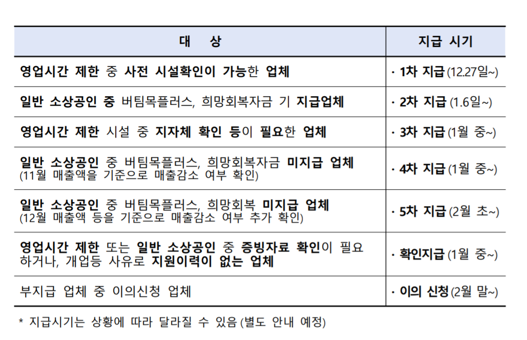 소상공인 방역지원금 3차 지급 (2022년 1월 17일부터 지급)은 2021년 12월 18일 이후 중안안전대책본부 (중대본)의 영업시간 제한조치를 받은 소상공인, 소기업 중 2022년 1월 4일까지 지자체로부터 영업시간 제한에 따른 행정명령이행확인서를 발급받아 시설확인 및 행정명령 이행 사실이 확인된 사업체 지원된다. 2022년 1월 5일이후 행정명령이행확인서를 받은 기업은 2022년 2월 10일 이후 신청을 안내할 예정이라고 한다.