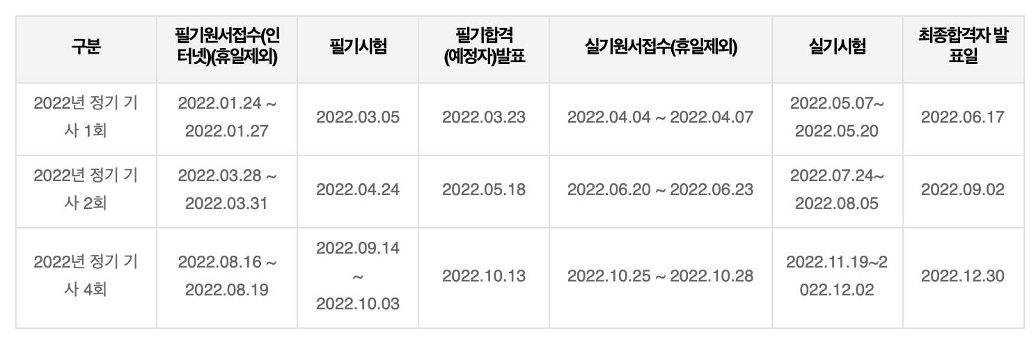 아래의 표는 2022년 건축기사 시험 일정입니다. 건축기사 자격 취득을 위해서는 필기와 실기 총 두 번의 시험에 합격해야 합니다. 건축기사 시험은 1년에 단 3번만 실시합니다. 1회차, 2회차 그리고 4회차 실시합니다.