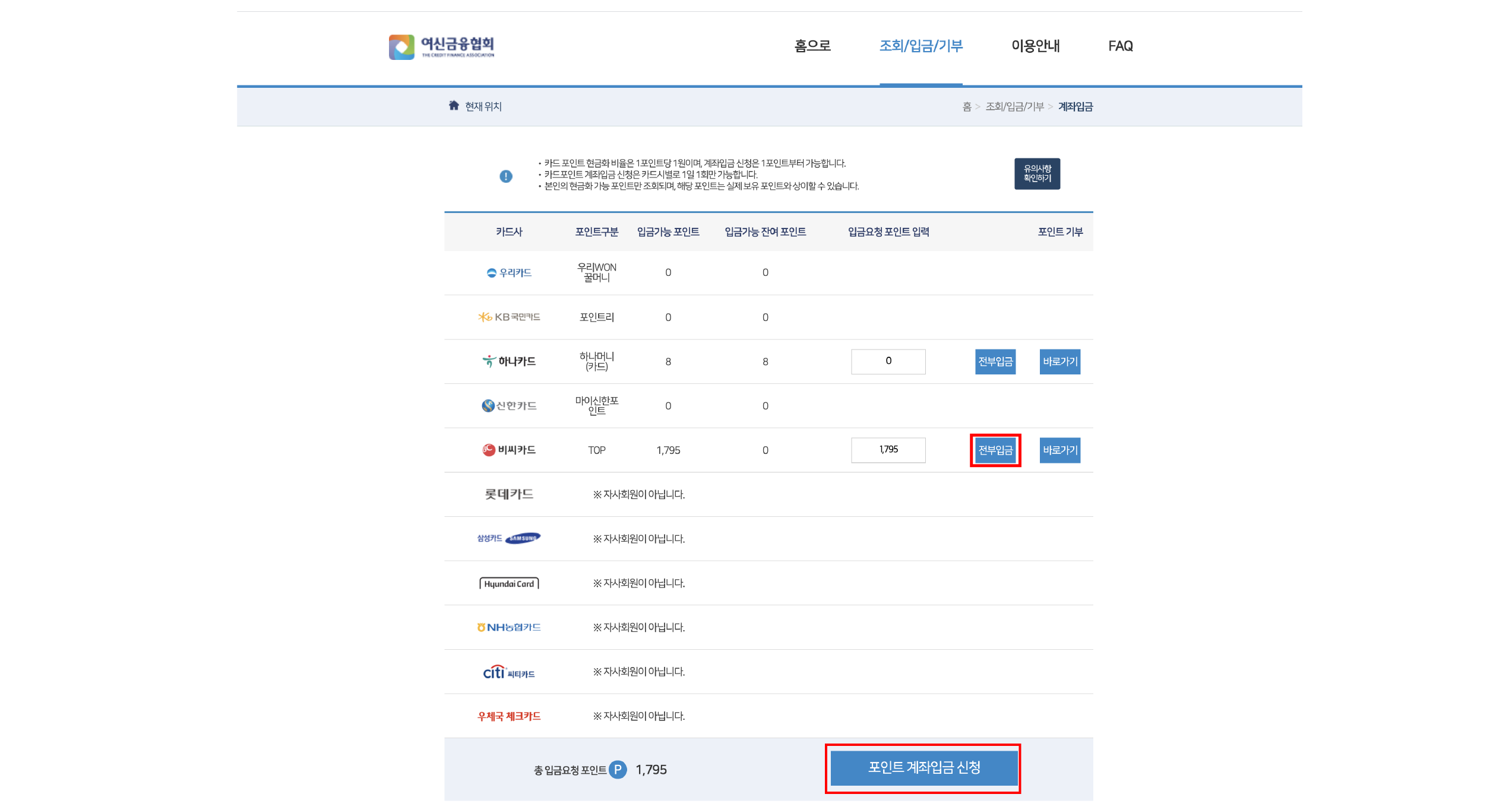 조회만 하실 건 아니니까, 카드포인트 계좌입금/기부 버튼을 클릭합니다.