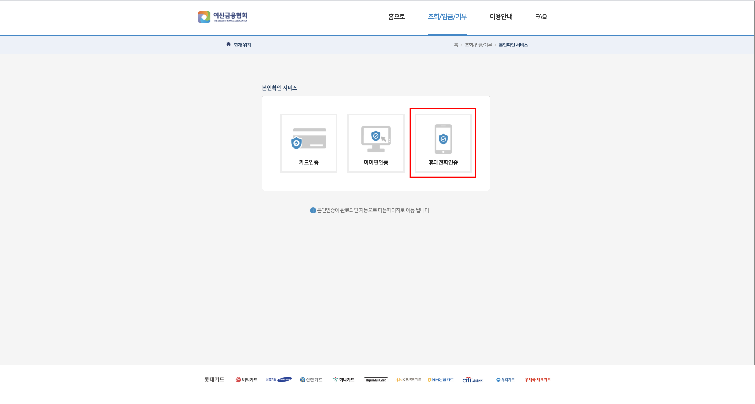 카드인증, 아이핀인증, 휴대전화인증 중 편하신 인증을 선택합니다. 저는 휴대전화인증을 선택했습니다.
