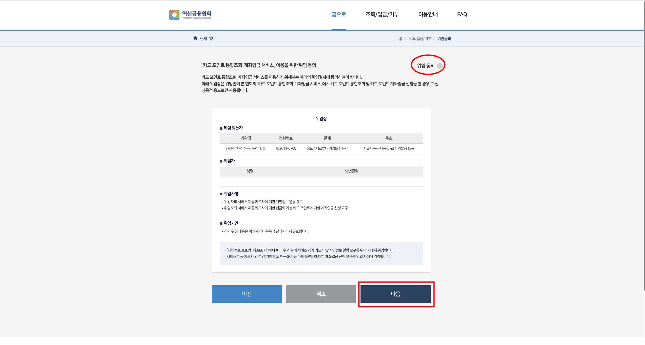 인증을 마치고 나면 위와 같이 위임 동의 페이지가 나옵니다. 위임자(본인) 정보를 확인하고 위임 동의 클릭 후, 다음을 클릭합니다.