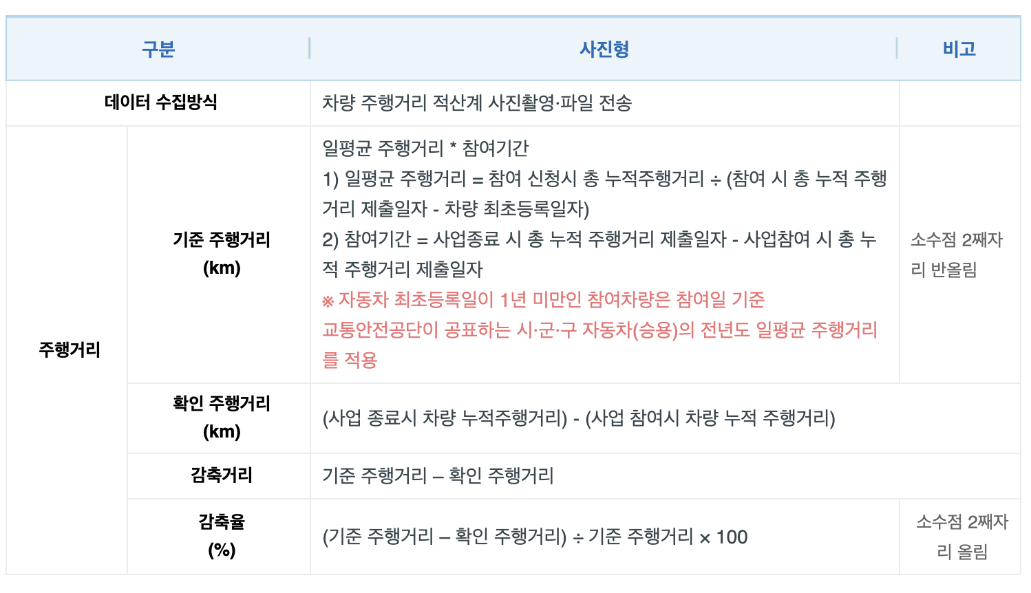 | 주행거리 | 감축율(%) | 0이상~10미만 | 10이상 ~20미만 | 20이상~30미만 | 30이상~40미만 | 40이상 |