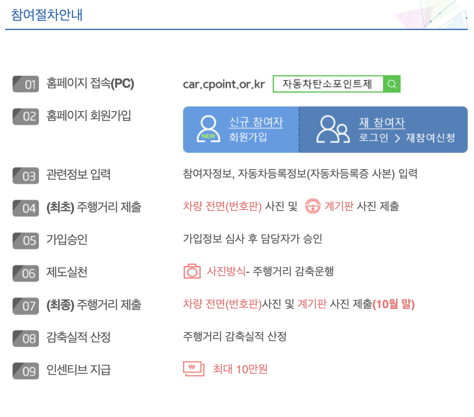 2월 ~3월 참여 신청을 받고, 3월 ~ 10월까지 자동차 탄소포인트제를 실천하고 10월에 주행거리 실적을 제출하면 12월에 인센티브가 지급됩니다.