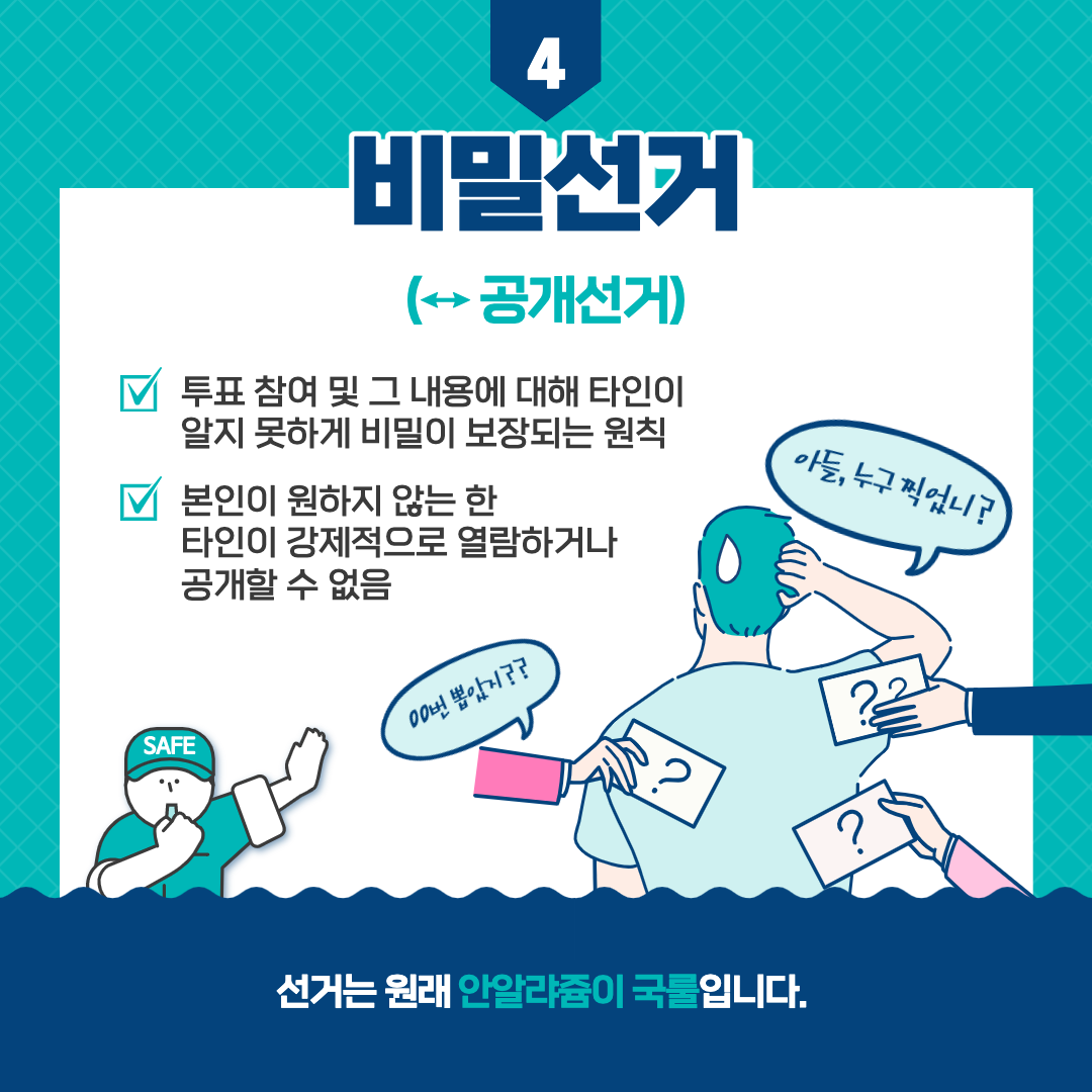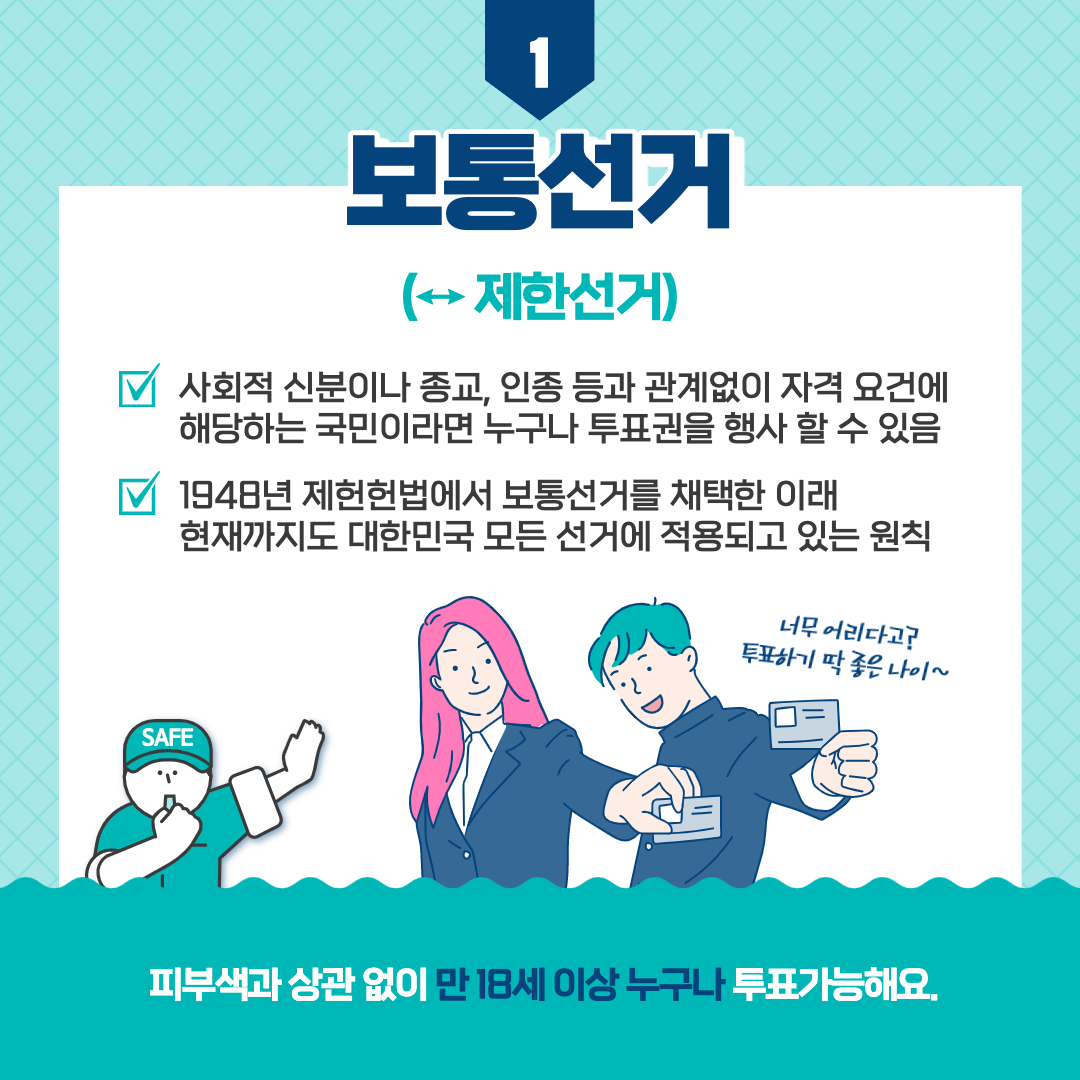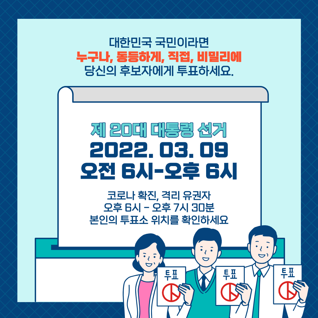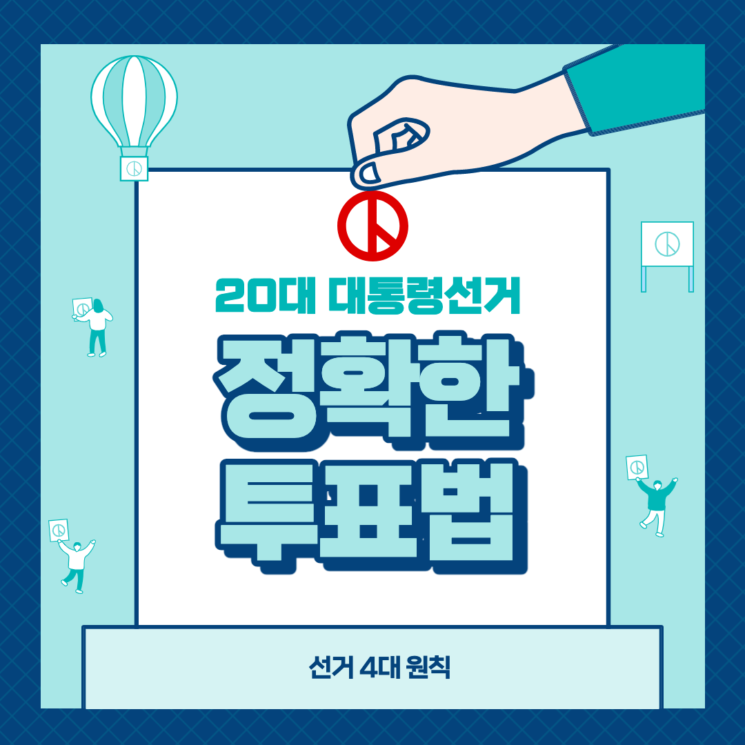 2022년 3월 9일은 제 20대 대통령 선거날입니다. 이번 대통령 선거는 2019년 만 18세로 선거권이 하향된 후에 치뤄지는 첫 대선입니다. 만 18세 이상 대한민국 국민이라면 선거권자로 대통령 선거에 참여할 수 있습니다. 민주주의의 꽃이라고 불리는 선거! 대한민국 선거 4대 원칙에 따라 소중한 1표 행사하시길 기원합니다.