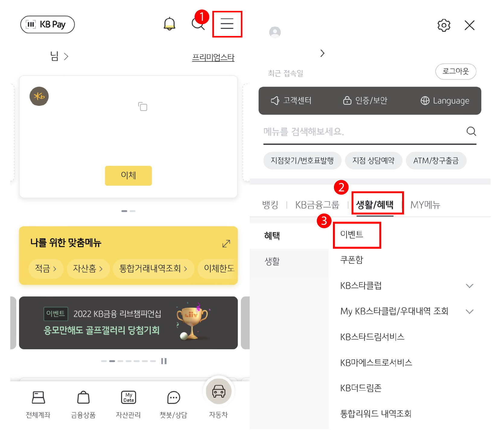 참여 방법은 매우 간단합니다. 우선 KB스타뱅킹 앱을 설치합니다. 5번 클릭으로 이벤트 참여를 할 수 있습니다.