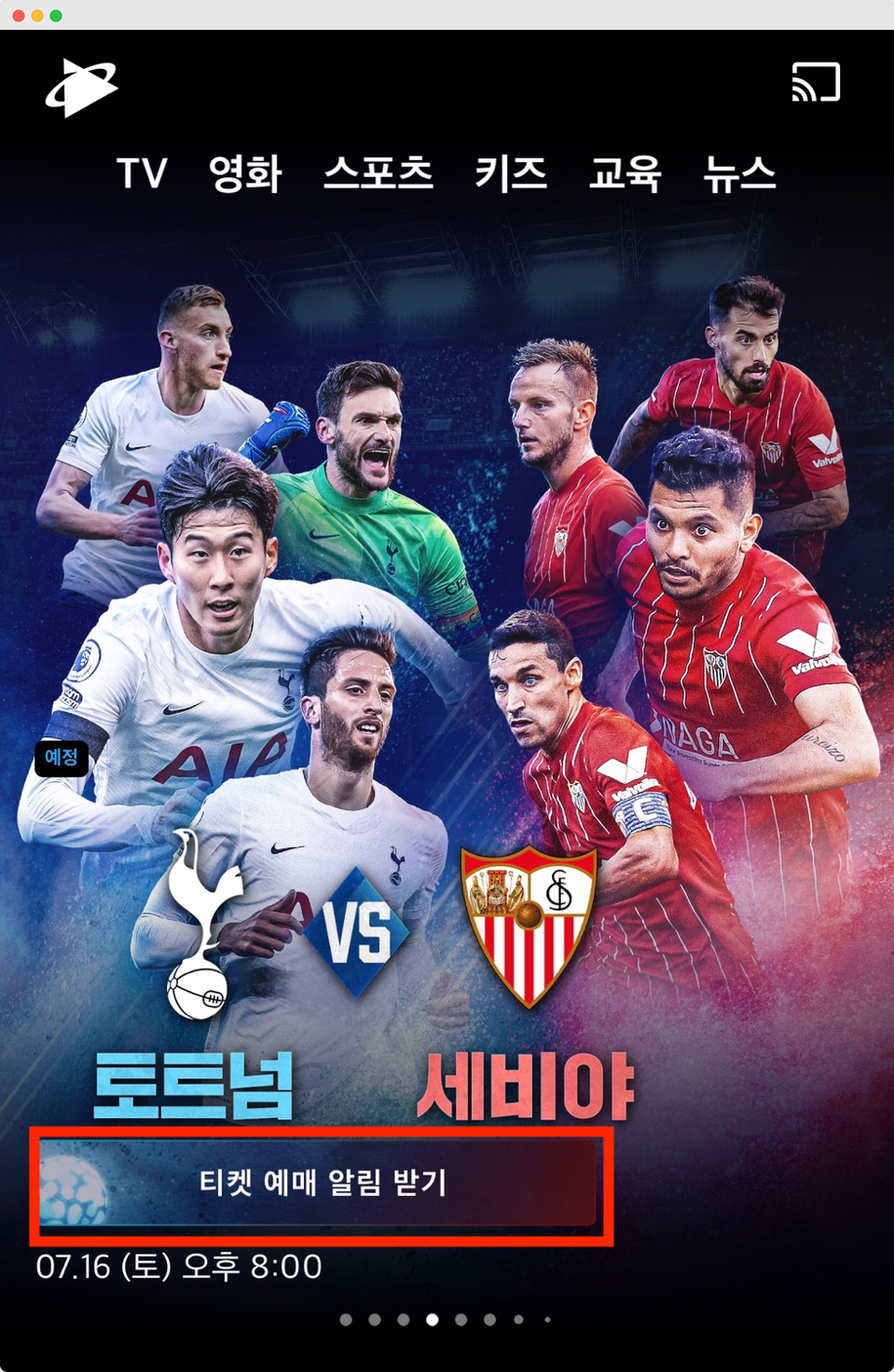 티켓 예매를 위해서는 쿠팡 플레이 앱이 설치가 되어 있어야합니다. 이미 쿠팡와우에 가입된 상태라면 쿠팡플레이에 접속하면 메인 화면에 토트넘 세비야 이미지 바로 아래 티켓 예매 알림 버튼이 있습니다. 티켓을 구매할 예정이시라면 반드시 푸시 알림을 신청하시기 바랍니다. 그럼 티켓 예매를 못할 경우에는 어디에서 경기를 볼 수 있을까요?