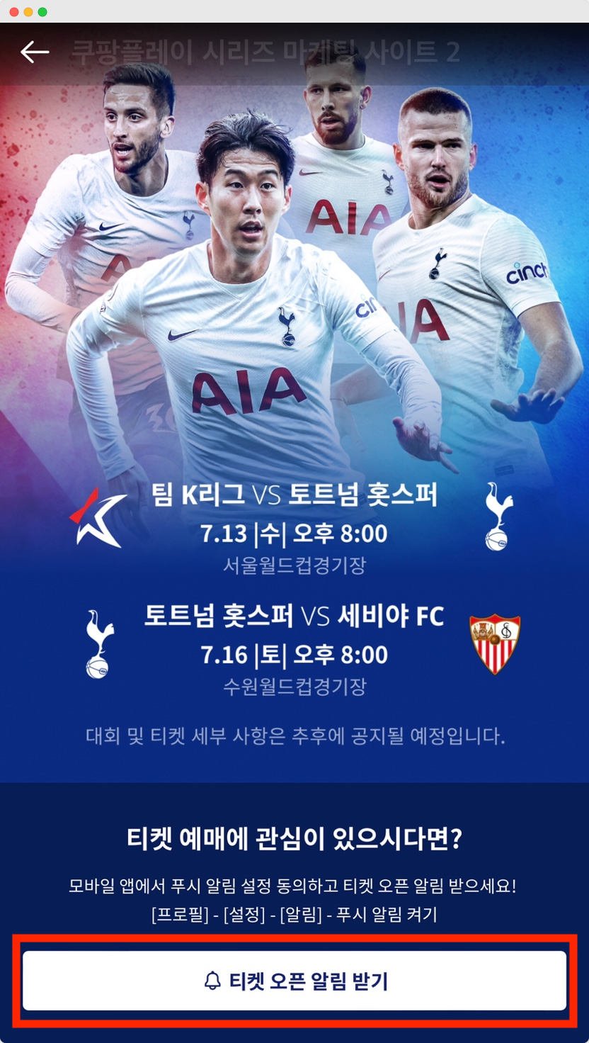 쿠팡플레이 공지에 따르면 이번 토트넘 친선 경기 티켓 예매 방법과 가격 세부사항은 쿠팡 플레이 트위터에 공지된다고 합니다.