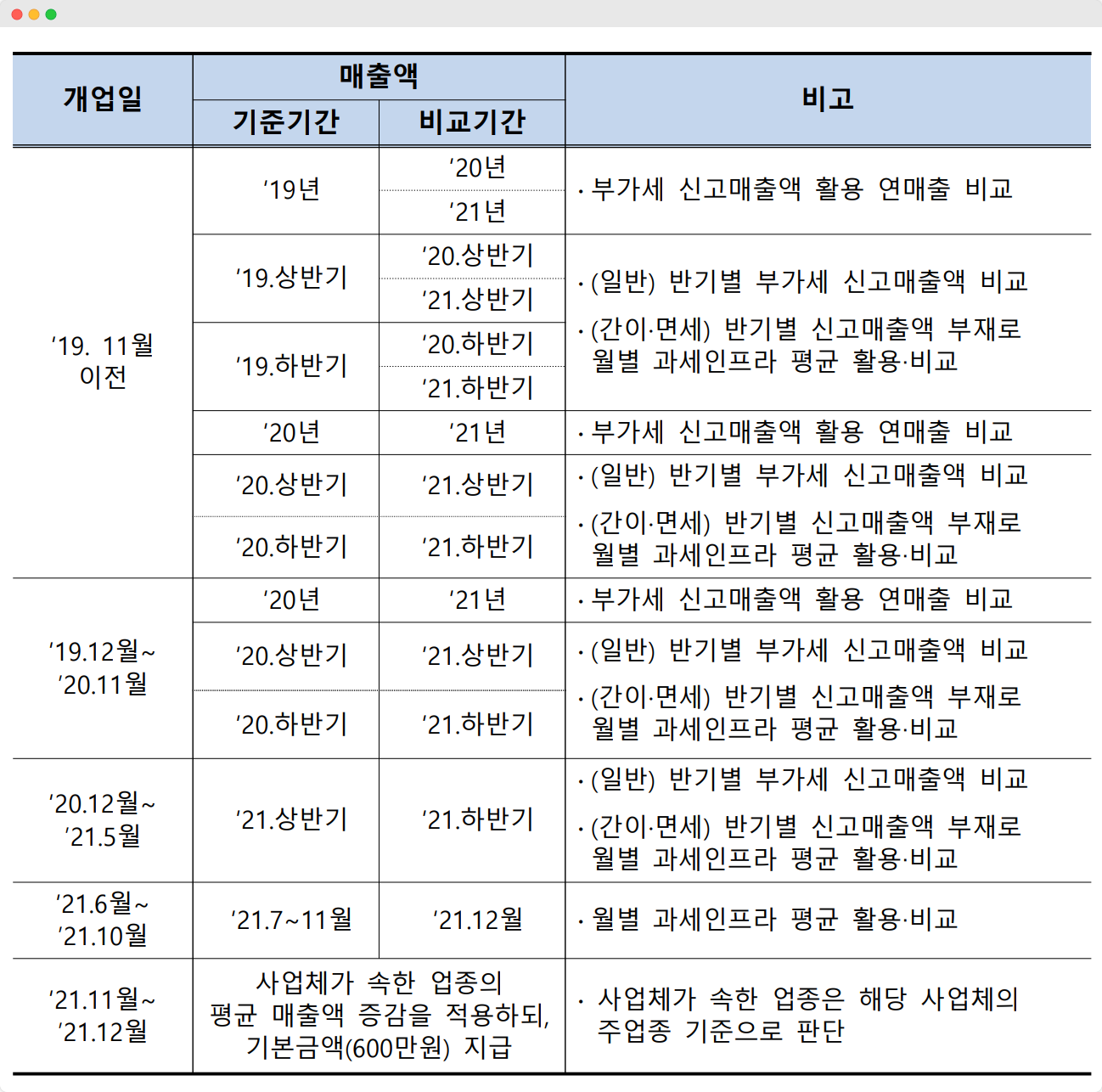 1차, 2차방역지원금에서는 년월별로 교차비교해 그 중에 매출 감소 구간이 하나라도 있다면 방역지원금을 지원했습니다만 이번에는 아래의 표와 같이 교차비교 없이 1:1로 매출을 비교하여 매출 감소한 사업체를 선정했습니다.