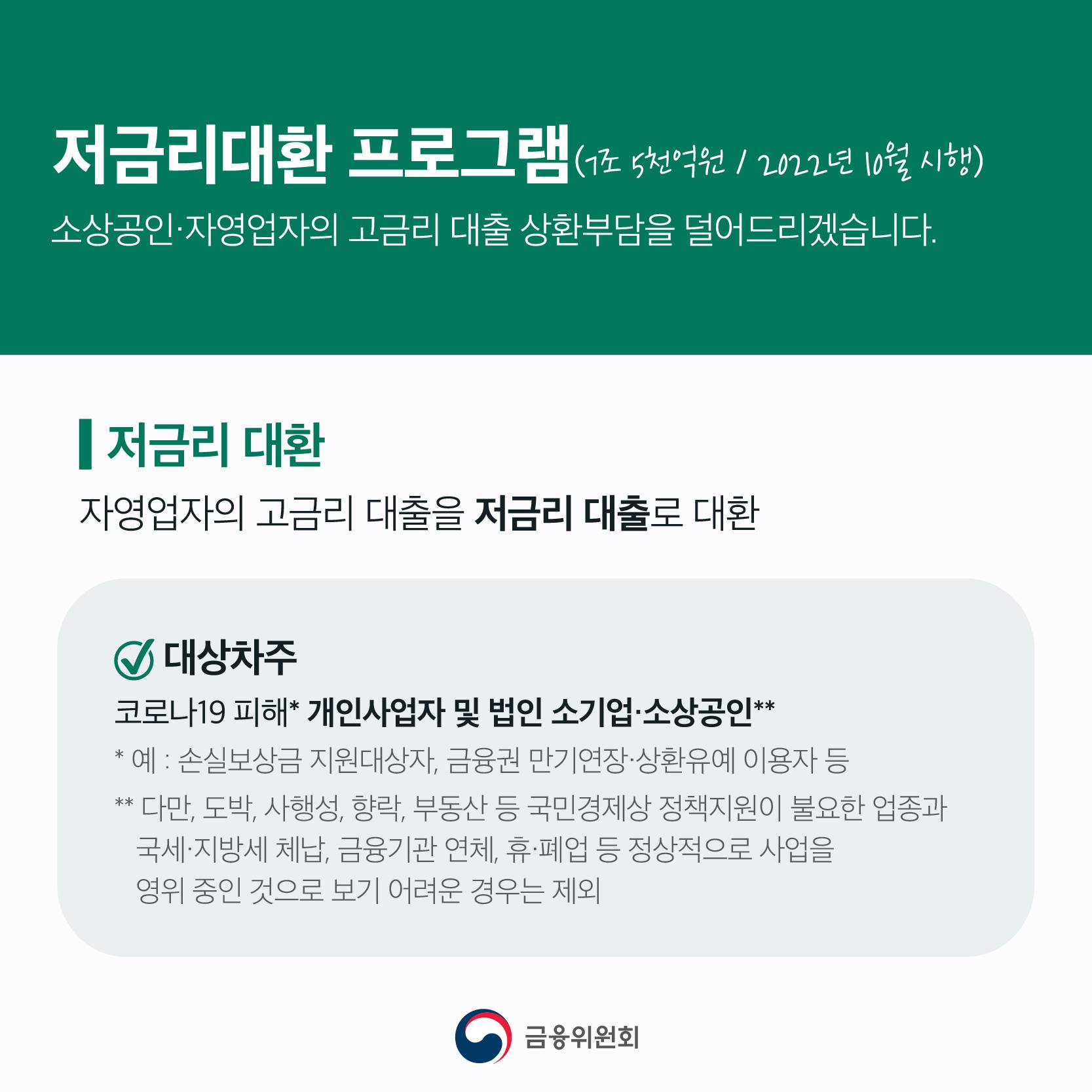 2022년 하반기 고금리 대출로 힘든 소상공인 자영업자 지원을 위해 신규 대출, 저금리대환 프로그램 그리고 채무조정 프로그램을 시행합니다.