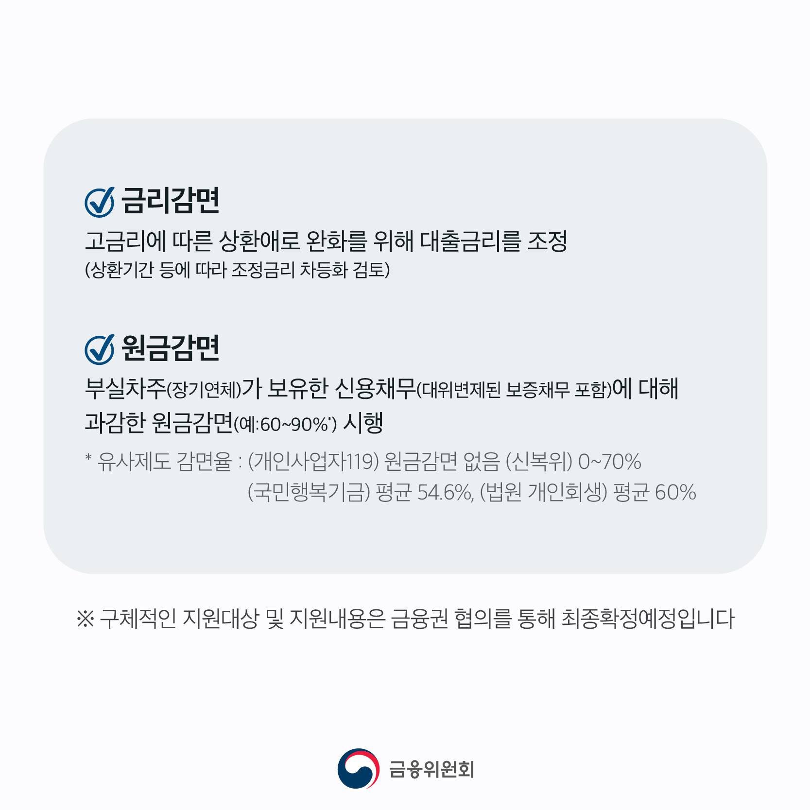 | ✔️ 원금감면 | 부실차주(장기연체)가 보유한 신용채무 (대위변제된 보증채무 포함)에 대한 과감한 원금감면 시행 |