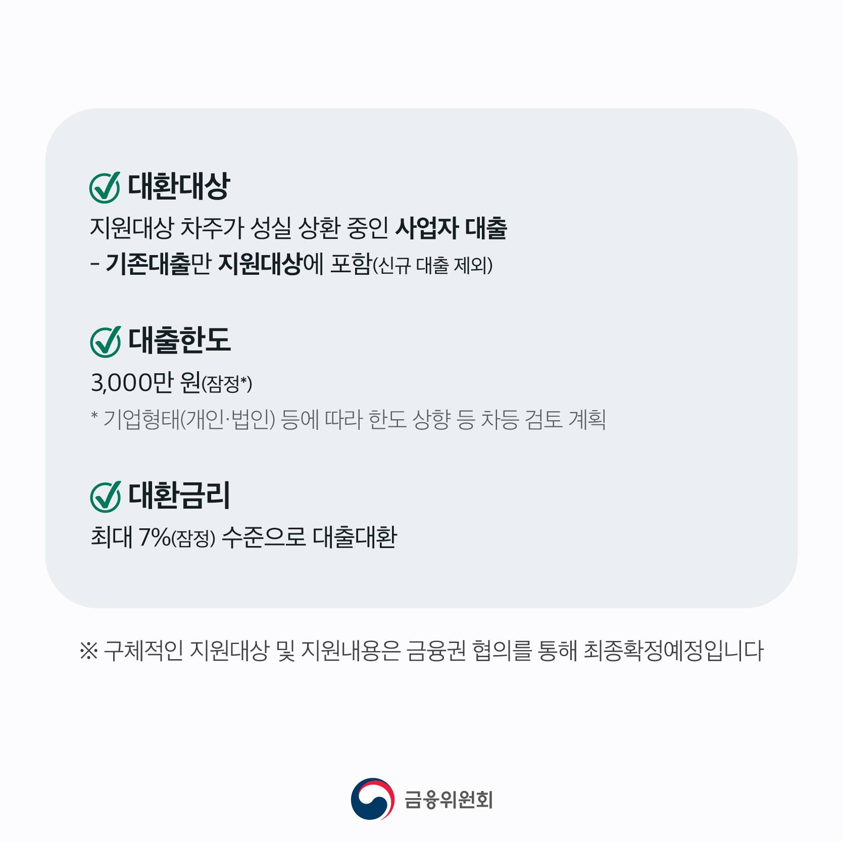 | ✔️ 대출한도 | 3,000만원 한도, 기업형태 등에 따라 한도 상향 등 차등 검토 계획 |