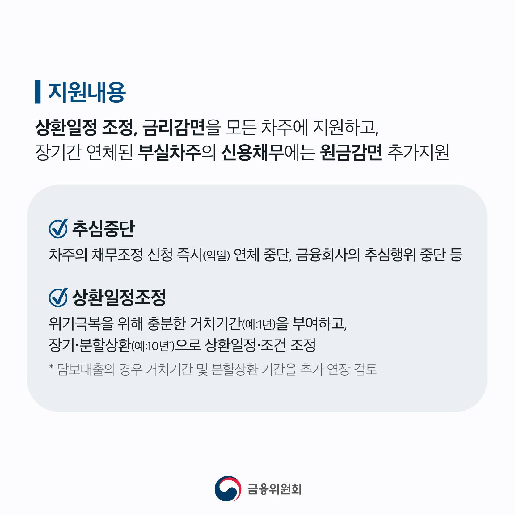 상환일정 조정, 금리감면을 모든 차주에 지원하고, 장기간 연체된 부실차주의 신용채무에는 원금 감면 추가 지원
