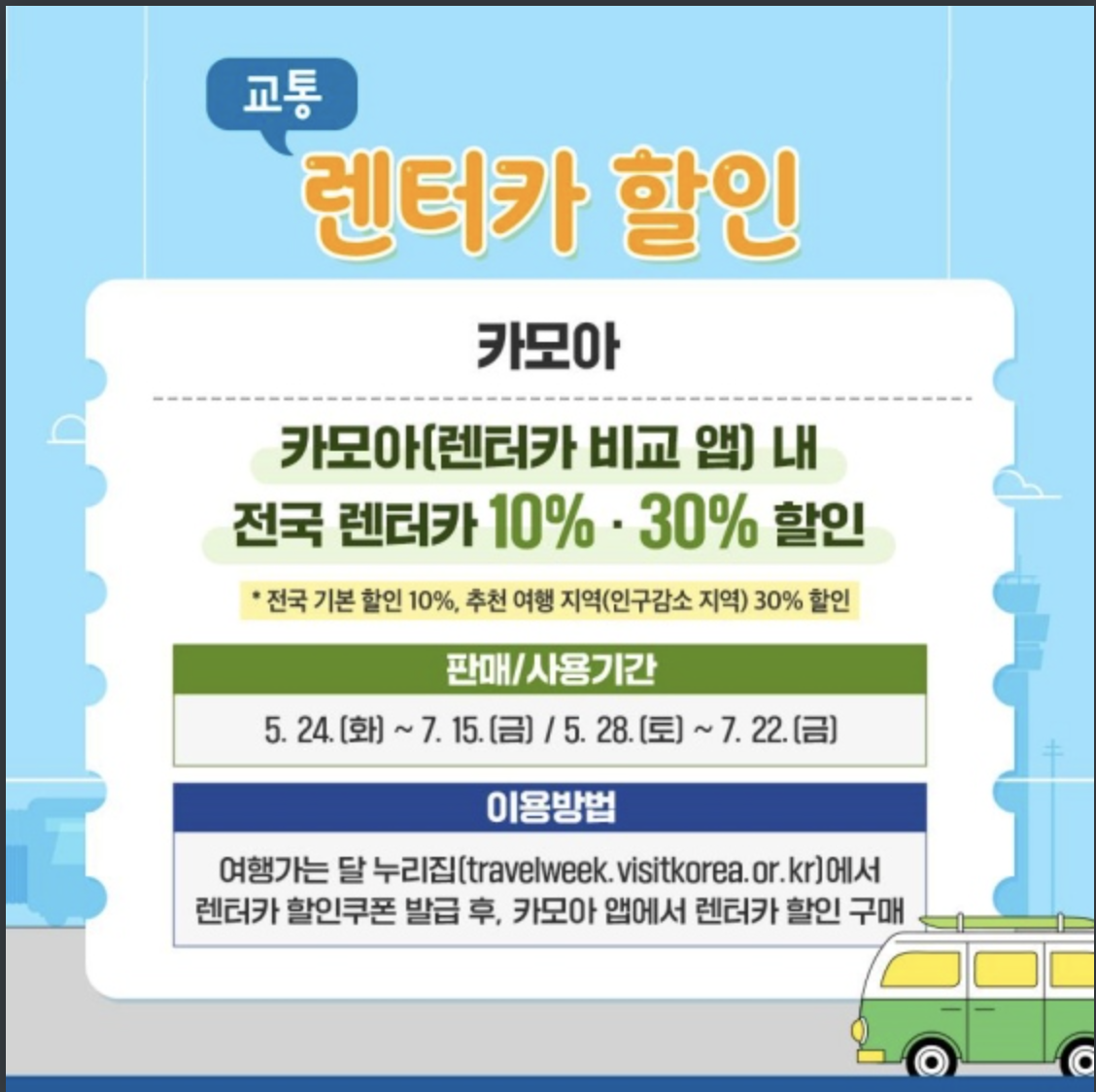 이용방법 | 여행가는 달 누리집 (travelweek.visitkorea.or.kr)에서 렌터카 할인쿠폰 발급 후, 카모아 앱에서 렌터카 할인 구매 |