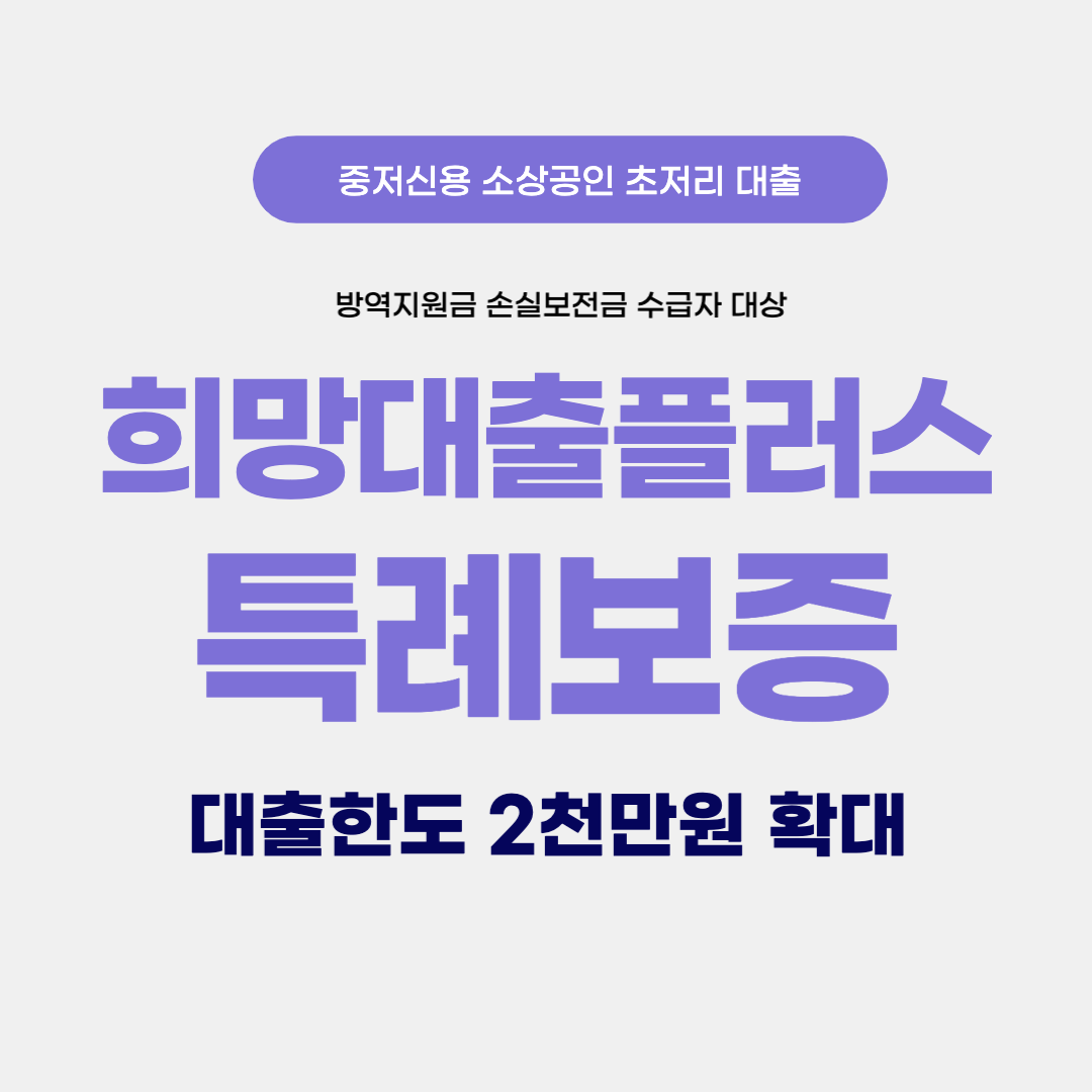 소상공인 '희망대출플러스' 지원 대상 및 대출 한도를 1천만원에서 2천만원까지 확대합니다. 점점 금리가 인상되는 시기에 '희망대출플러스' 신청 조건에 해당하시는 중 · 저신용 소상공인은 가지고 있던 고금리 대출을 대환하시거나, 부담없이 자금 운용할 수 있는 좋은 상품입니다.