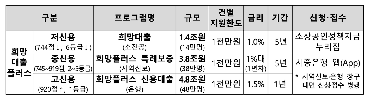 소상공인 '희망대출플러스' 지원 대상 및 대출 한도를 1천만원에서 2천만원까지 확대합니다. 점점 금리가 인상되는 시기에 '희망대출플러스' 신청 조건에 해당하시는 중 · 저신용 소상공인은 가지고 있던 고금리 대출을 대환하시거나, 부담없이 자금 운용할 수 있는 좋은 상품입니다.