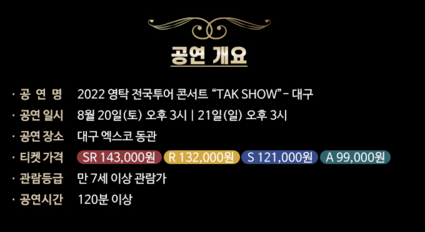 | 대구 | 08.20 ~ 08.21 | 대구 엑스코 동관 | 07.13 20:00 🔗 예매 바로가기 ➡️ |