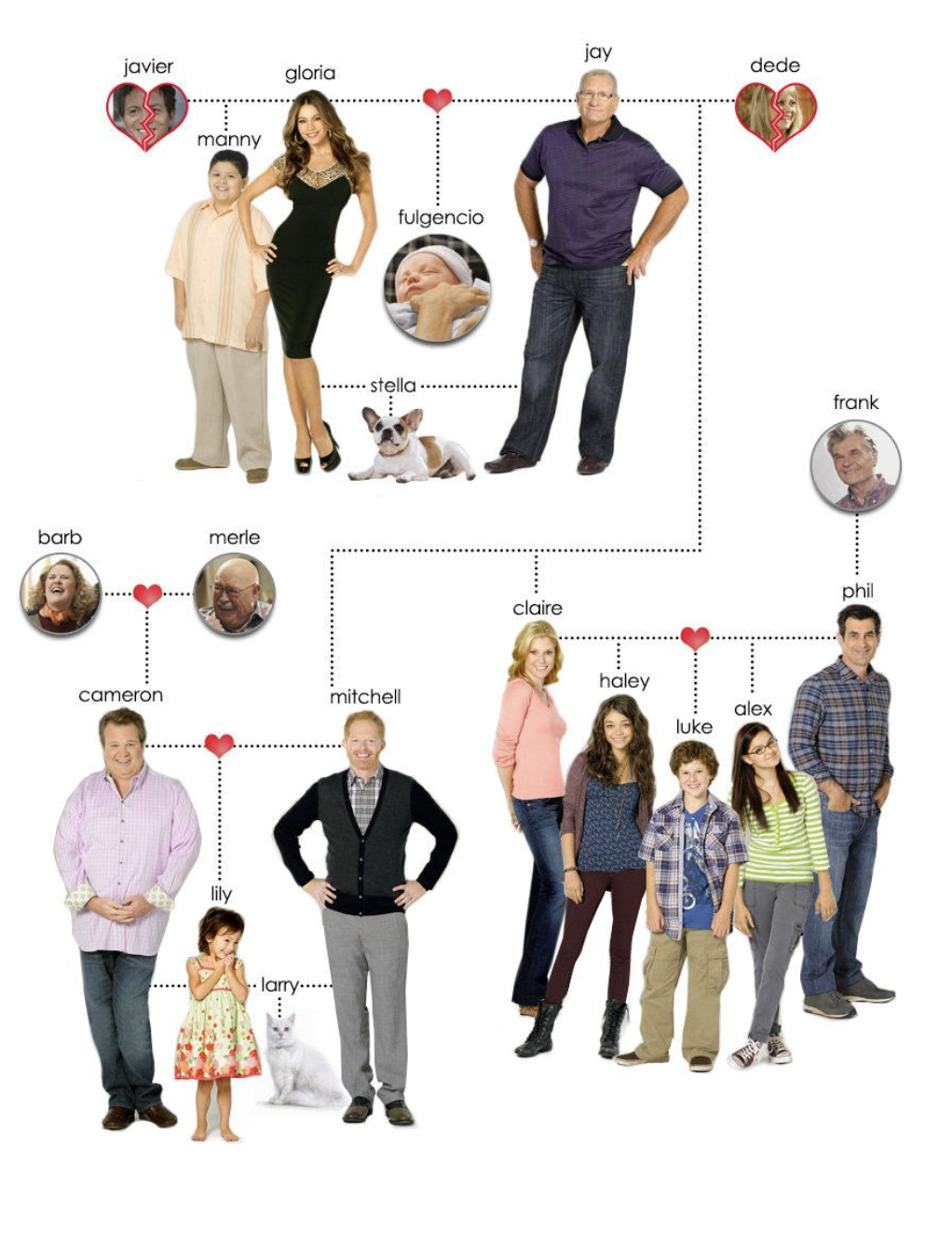 모던 패밀리는 미국 가족 시트콤으로 로스앤젤레스에 사는 프리쳇 (Pritchette) 가족들의 일상을 그려낸 일대기이다. 시트콤 제목대로 미국 현대 다양한 형태의 가족들이 나온다. 아들이 있는 젊은 멕시코 여자와 재혼한 부자 아버지 가족, 사고 쳐서 결혼을 했으나 아이들 셋과 함께 행복하게 살고 있는 중산층 딸 가족, 베트남에서 입양한 딸과 함께 남자 친구와 살고 있는 (추후 법이 바뀌어 결혼한) 게이 아들 가족이 나온다.
