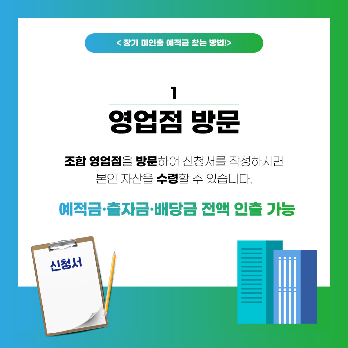 장기 미인출 예·적금을 찾는 방법으로 두 가지가 있습니다. 본인에게 편한 방법을 택하셔서 잠자고 있는 예·적금을 꼭 찾아가시기 바랍니다.