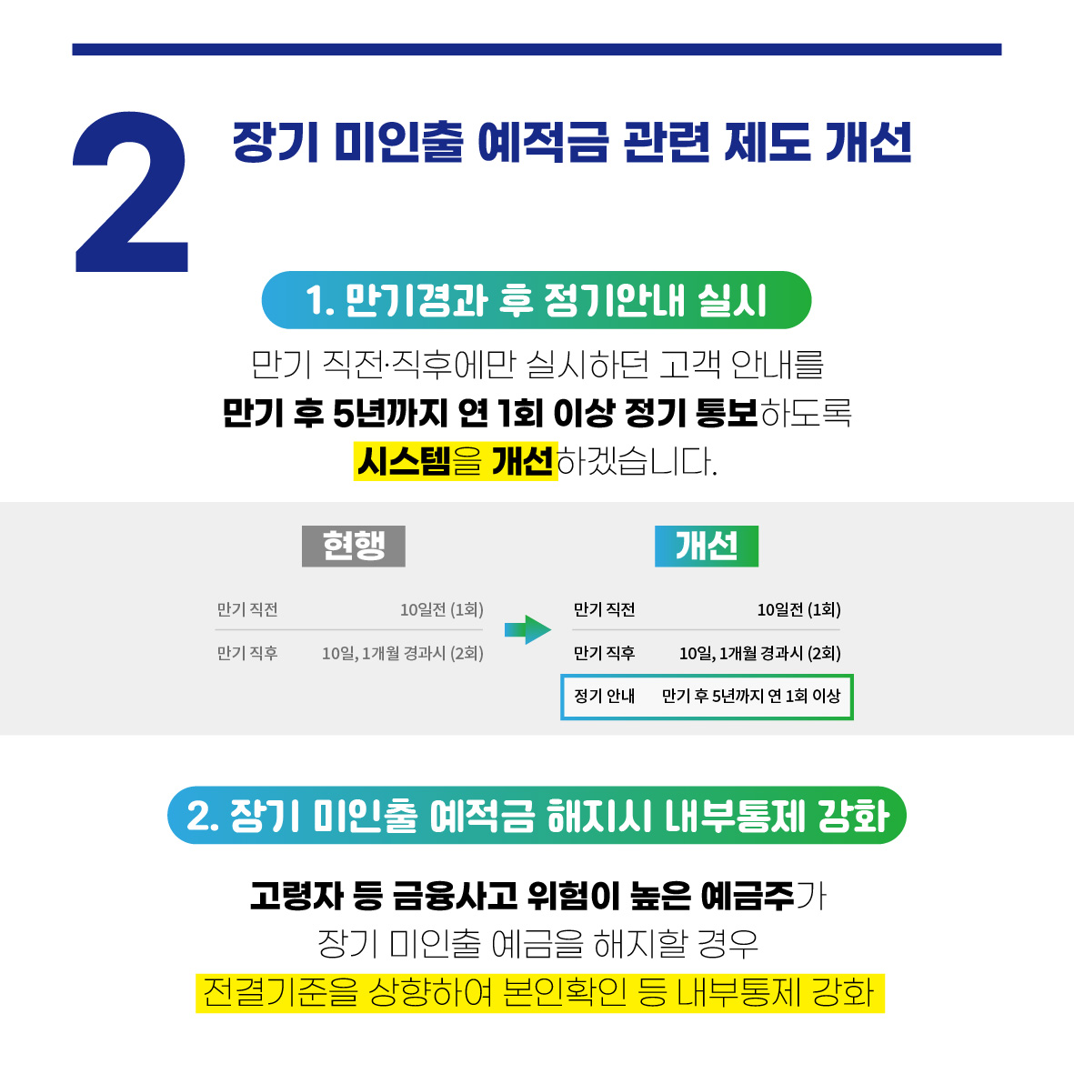 9월 5일부터 10월 7일 약 4주간 5개 상호금융 중앙회 (신협, 농협, 수협, 산림, 새마을금고) 공동으로 「장기 미인출 예·적금 찾아주기 캠페인」을 실시합니다. 만기 후 1년 이상 미거래 예·적금을 보유한 분들에게 문자 또는 이메일 등을 통해 개별 안내를 드립니다.