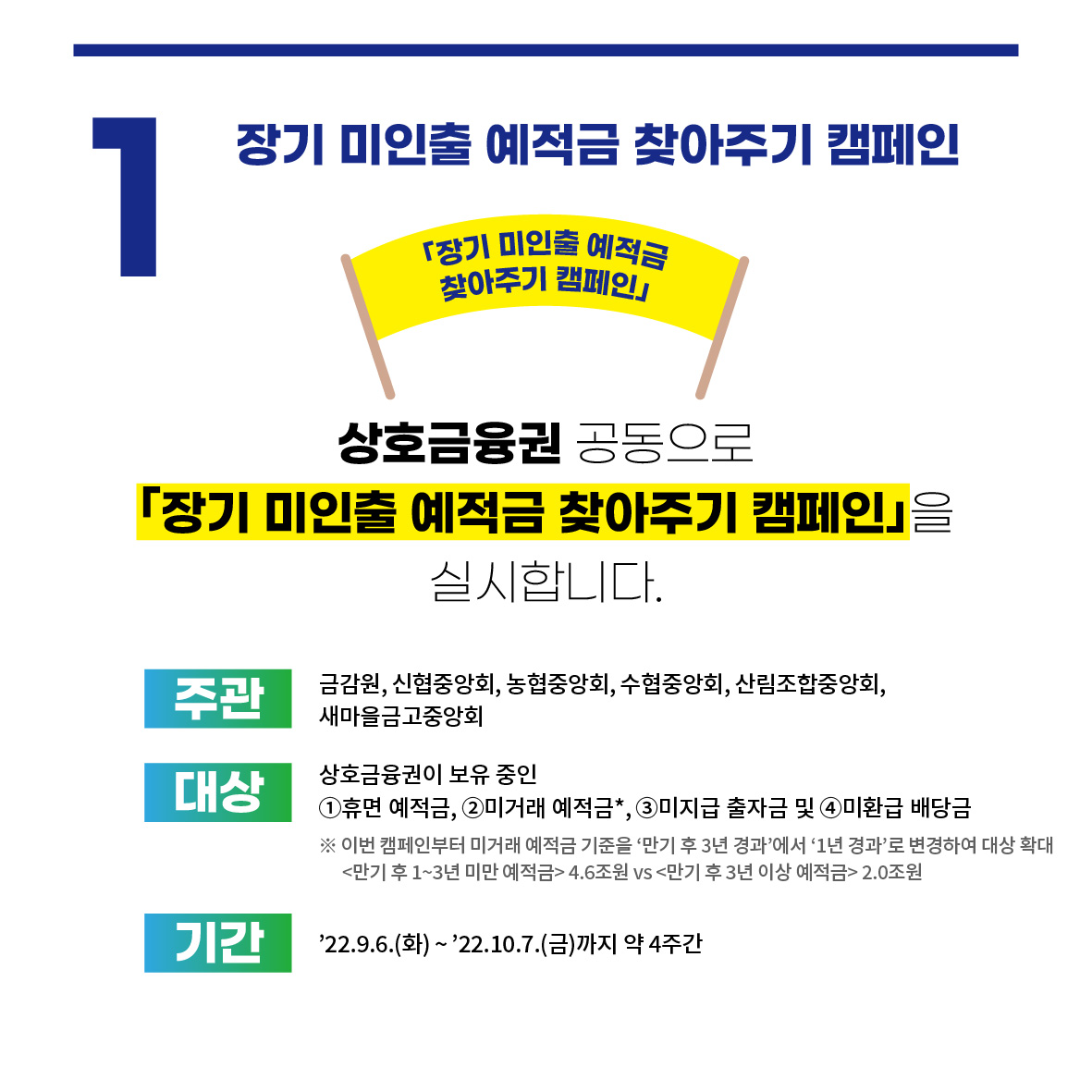9월 5일부터 10월 7일 약 4주간 5개 상호금융 중앙회 (신협, 농협, 수협, 산림, 새마을금고) 공동으로 「장기 미인출 예·적금 찾아주기 캠페인」을 실시합니다. 만기 후 1년 이상 미거래 예·적금을 보유한 분들에게 문자 또는 이메일 등을 통해 개별 안내를 드립니다.