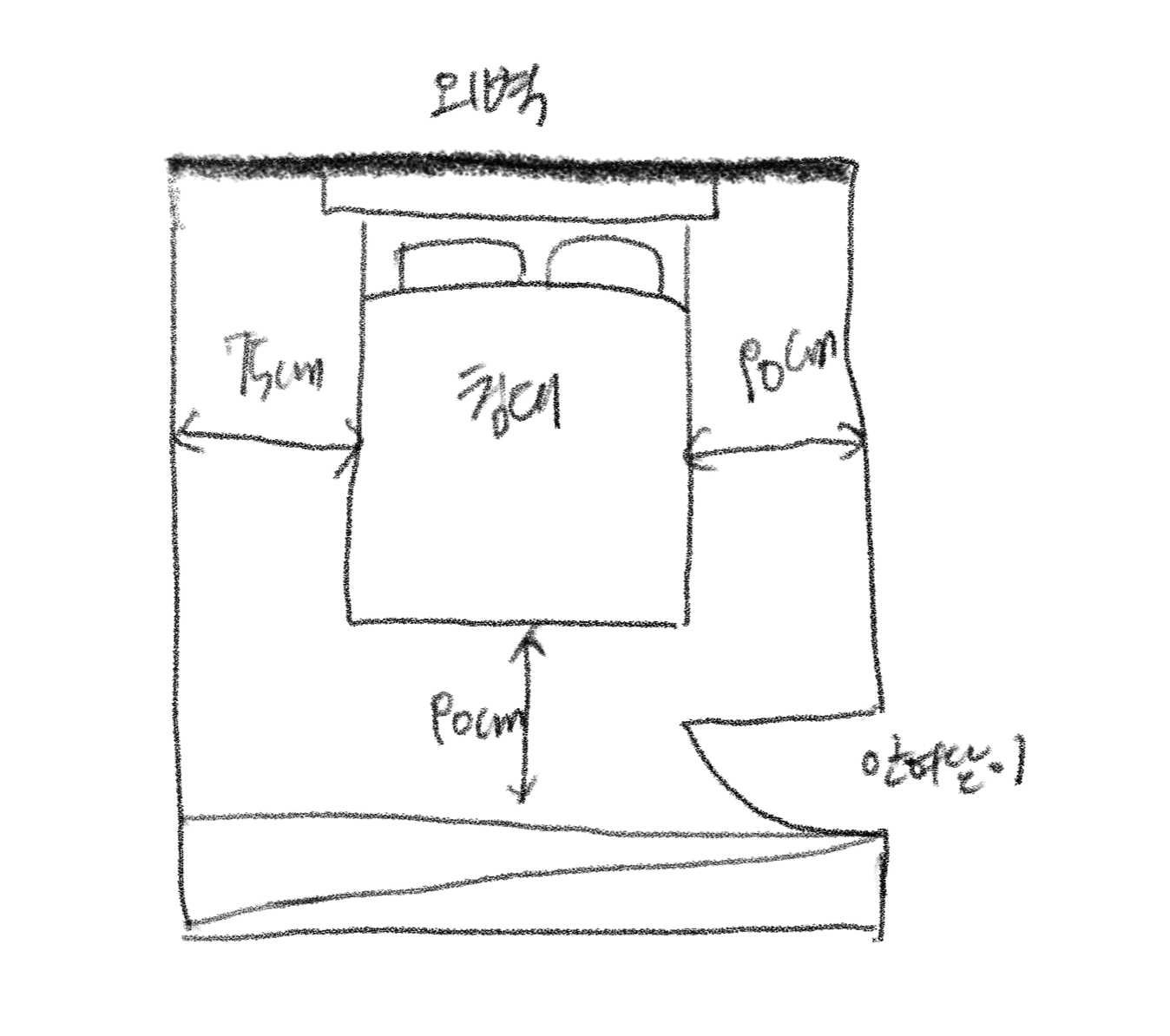 - 침대 하부 발치쪽은 90cm 이상의 여유를 둠