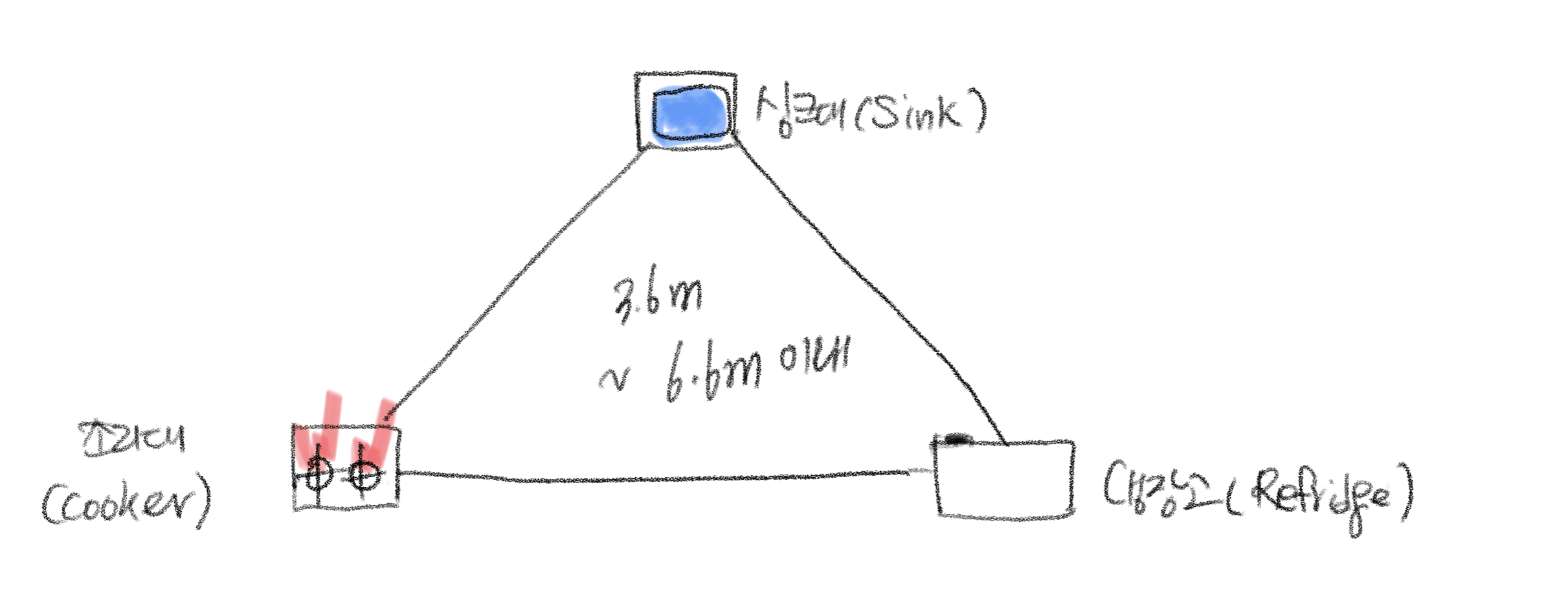 - 직선형: 부엌이 작은 소규모 주택, 동선의 혼란이 없는 반면 움직임이 많아 동선이 길어지는 경향이 있음
